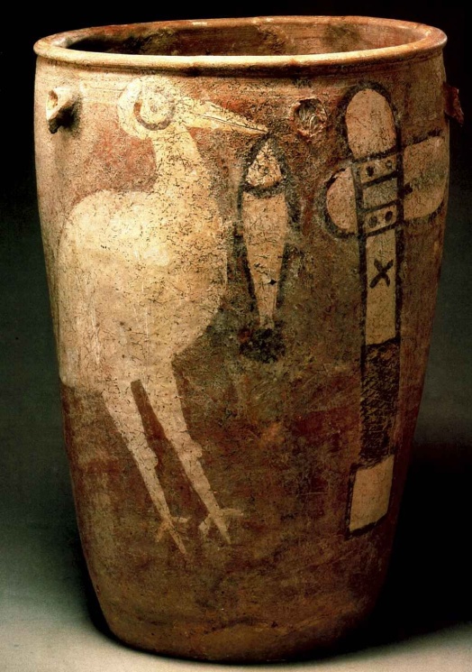Рис. 12бРис. 12бРис. 12аРис. 12аВариант с «разрезанием» тела рыбы, отделения частей различной природы (переданы различной орнаментикой) можно видеть на сосуде, внешний вид которого и «развёртка» изображения приведены на рис. 12 а, б и 13. Здесь птица держит в клюве некий чечевицеобразный предмет, острой оконечностью которого рассекает рыбу, наделённую чертами дракона (голова), вдоль «шва», соединяющего разнородные части. При этом нельзя сказать, что это разноокрашенные спинка и брюшко рыбы – её голова развёрнута так, что видно: разрез ведётся по вертикали, вдоль позвоночника.