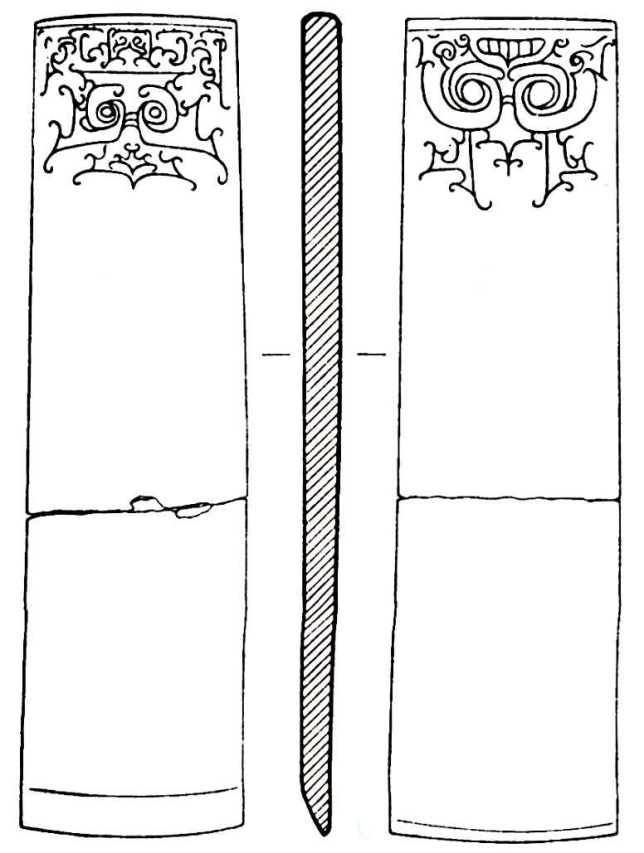 В таком контексте становится понятной орнаментация нефритового резца, прорисовка которого представлена на рис. 16. Рис. 16Рис. 16Резец этот, скорее всего, исполнял роль «уского меча» в ритуале, символически воспроизводящем сотворение мира из тела Гуня. На одной из плоских поверхностей резца, у основания изображён символизирующий мужское начало фаллический символ (выступающий, на рис. 16 слева), а на другой – символизирующий женское начало, ктеический (пустой внутри, рис. 16 справа). При выполнении разреза, разрезаемое также рассекалось на «мужскую» и «женскую» части.