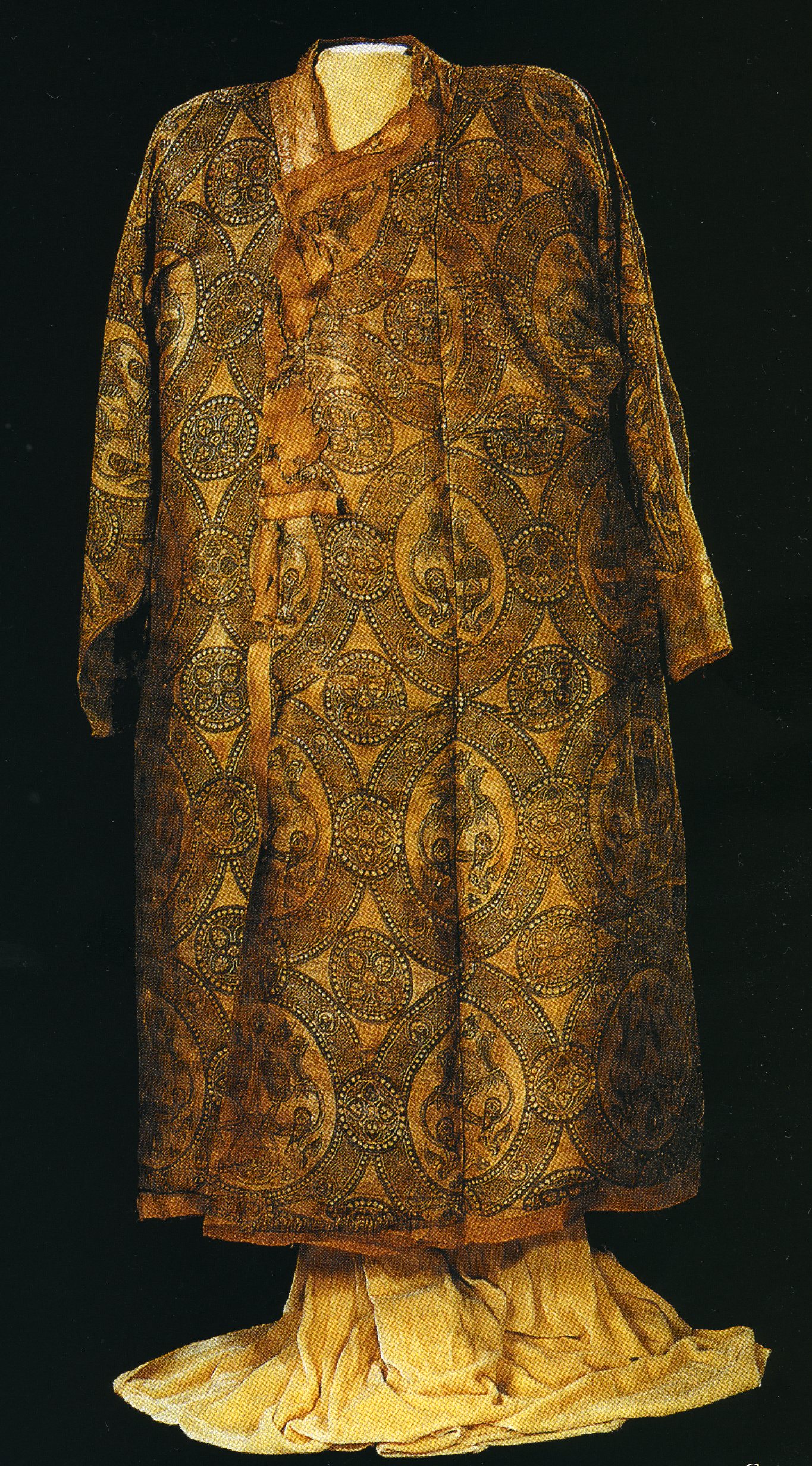 Парчовый халат пао с фигурами птиц в медальонах. Эпоха сунСледовательно, правомерно предположить существование, по крайней мере, двух вариантов расположения орнаментов в одеяниях этой эпохи. Головной убор, присутствующий во всех статуэтках и указывающий на его исходную обязательность для китайского костюма, имеет вид маленькой круглой шапочки, внешне напоминающей тюбетейку. Учитывая, что эти статуэтки, согласно общепринятой в науке точке зрения, изображали слуг, не исключено, что костюм иньской знати мог иметь какие-то другие особенности, выражающиеся, например, в характере кроя наплечной одежды (длине подола, ширине рукава), наличии специфических головных уборов и ансамбля украшений.