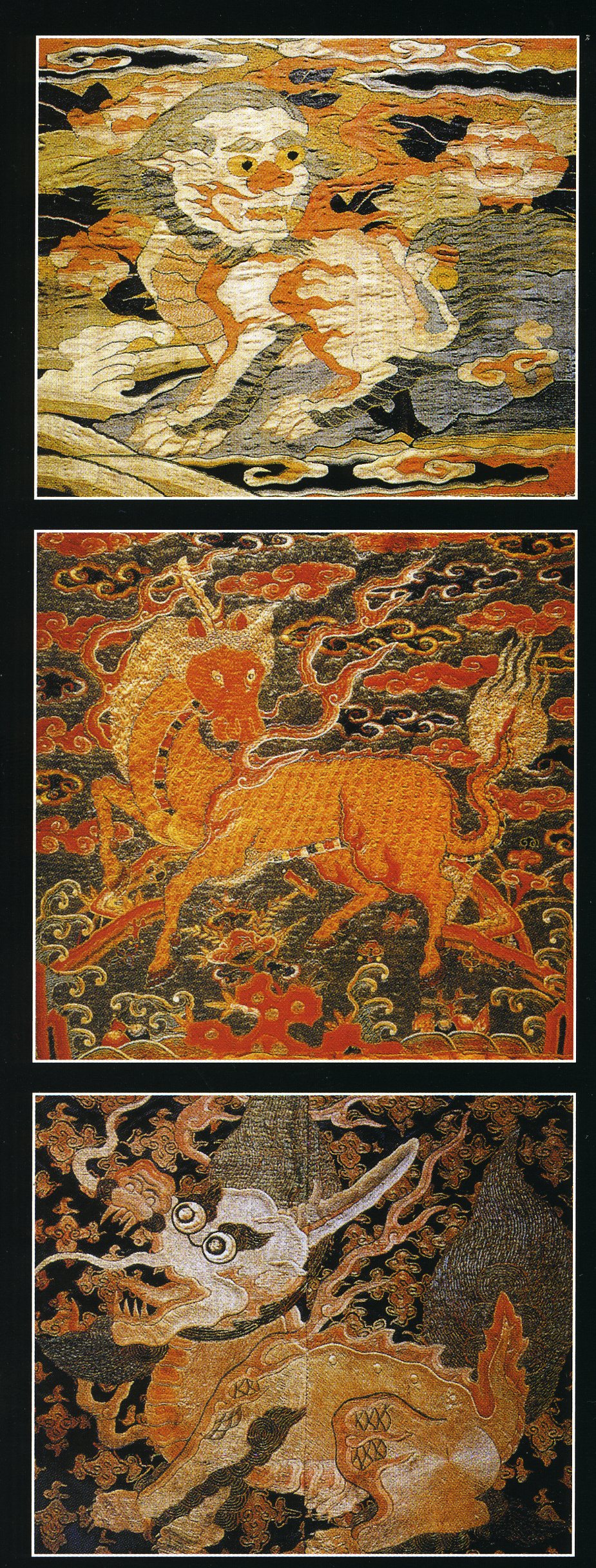 Ранговые нашивки бу-фан с фигурами животных. Шелк, парча, вышивка. Эпоха МинСистема опознавательных эмблем официального чиновничьего костюма установилась в эпоху Мин и была окончательно унифицирована при Цин. Такими эмблемами служили «нашивные квадраты» (