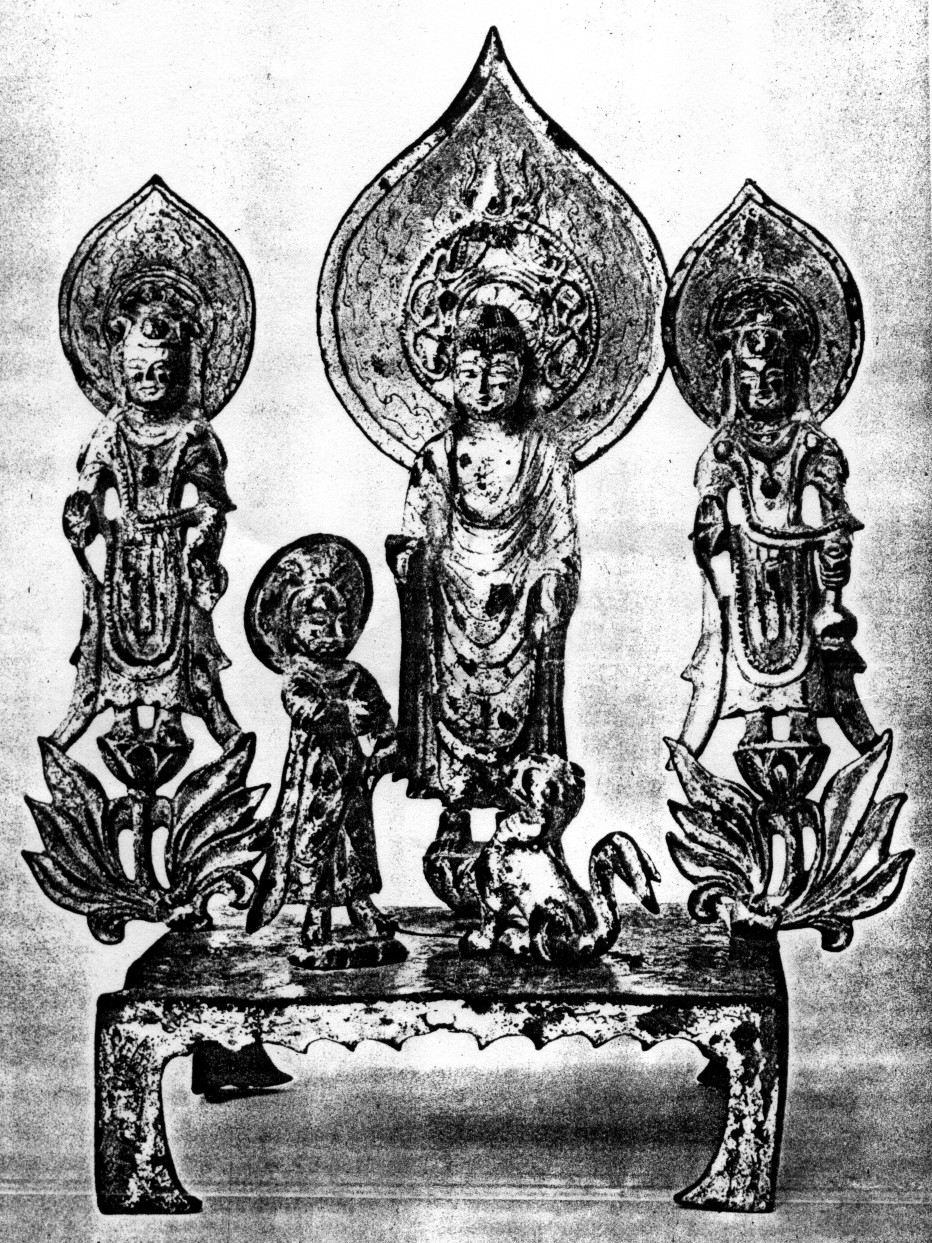 [1]. По верному, на наш взгляд, суждению Х. Бринкера, эти камерные алтарные группы и иконы для личных богослужений, хотя и дошедшие до нас в незначительном числе, имели несколько больше шансов сохраниться, чем ранние монументальные храмовые статуи, в основном утраченные из-за разрушений в периоды гонений на буддизм, войн и стихийных бедствий (см. [12, с. 154]).