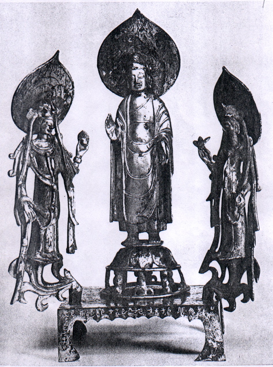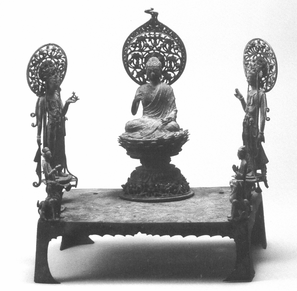 После превращения буддизма в мировую религию мелкая бронзовая пластика получила широкое распространение в обращенных странах. Этому способствовали такие обстоятельства, как легкость в изготовлении и тиражировании образов из бронзы, возможность вторичного использования материала, необходимость перемещения паломниками и миссионерами произведений культового характера на большие расстояния. В Китае, как и в других странах Дальнего Востока, существенную роль в развитии мелкой бронзовой пластики сыграл частный характер отправления буддийского культа в среде местной знати. Вместе с тем бронза, по давней китайской традиции, была привилегированным материалом для производства культовых предметов. Она активно применялась при изготовлении буддийских изображений в период правления Южных и Северных династий (420–589) на юге страны, однако на севере, по-видимому, все же не могла соперничать в популярности с камнем вплоть до VI в. Первые китайские изображения из бронзы часто были одиночными. В V в. появляются более сложные виды композиций, которыми стали, к примеру, триады, составленные обычно фигурами будды и двух