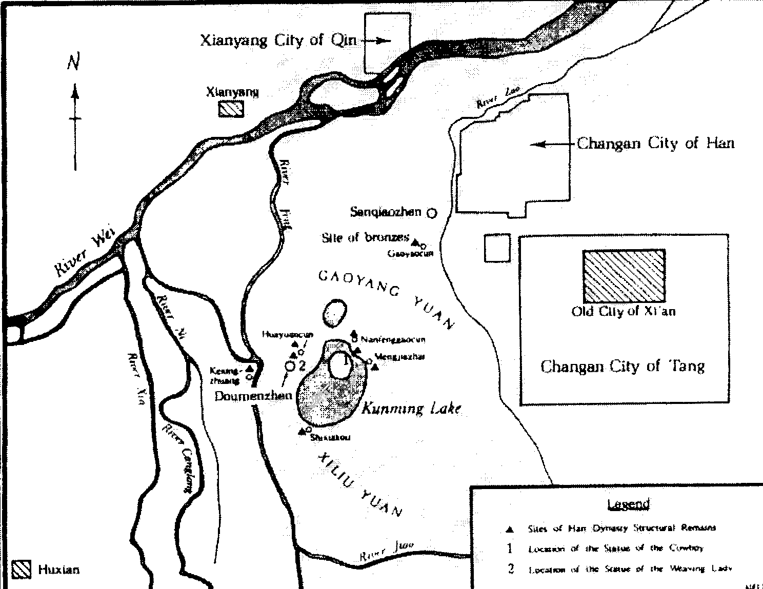 Кунминчи площадью около 10 кв. км для учений флота перед войной с государством Кунмин (на территории современной пров. Юньнань), впоследствии присоединенное к императорскому парку (см. [27, с. 375]). Проведенные раскопки позволили обнаружить ряд зданий, которые можно соотнести с известными по письменным источникам дворцами