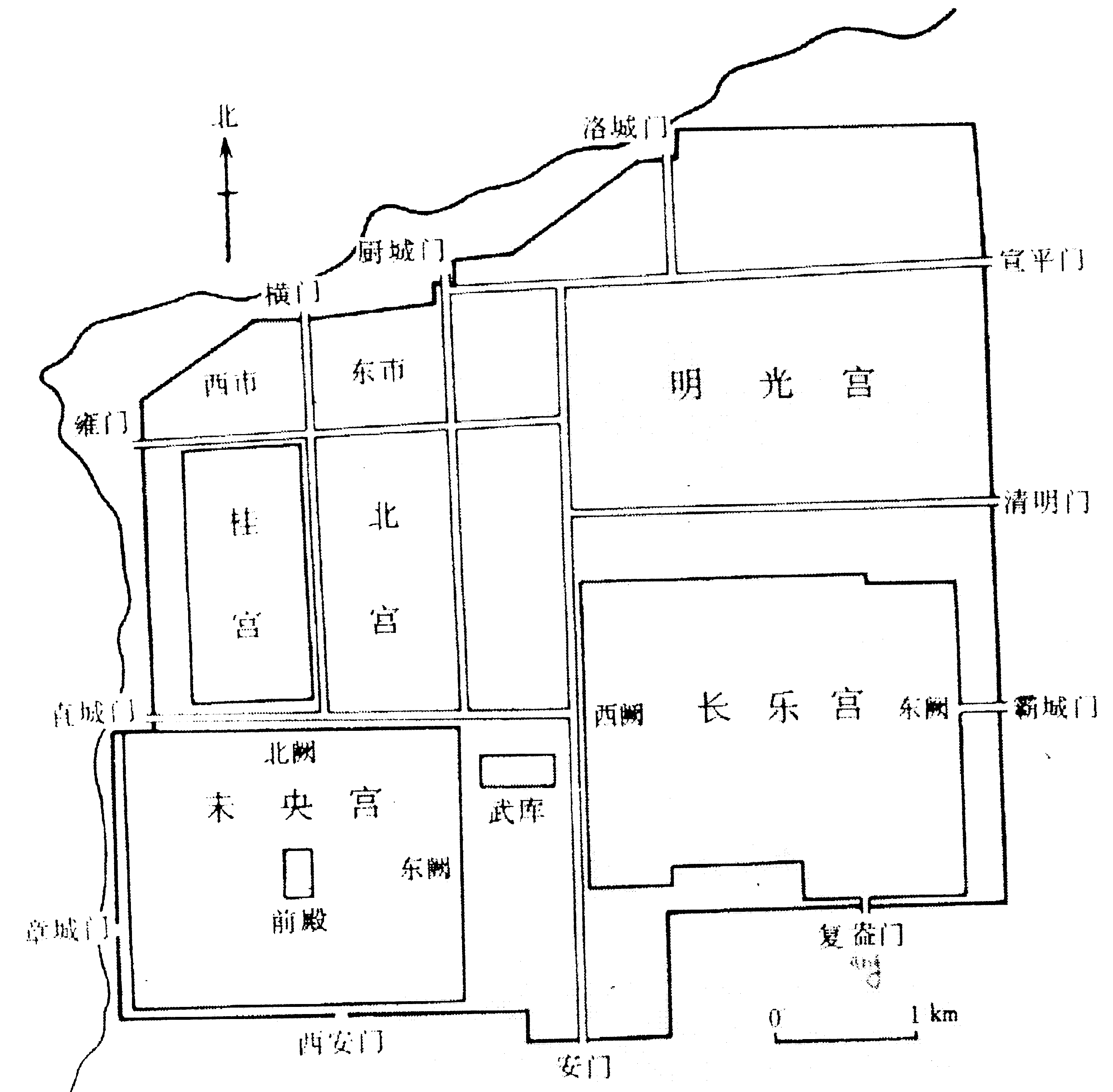 Чанлэгуна. В отличие от последнего, этот дворец был полностью построен при династии Хань. Он представлял собою почти правильный квадрат, окруженный стенами (северная и южная длиною по 2 250 м, западная и восточная – по 2 150 м, неплохо сохранился участок западной стены высотою в 11 м (см. [10, с. 7]), и занимал около 5 кв. км (приблизительно
