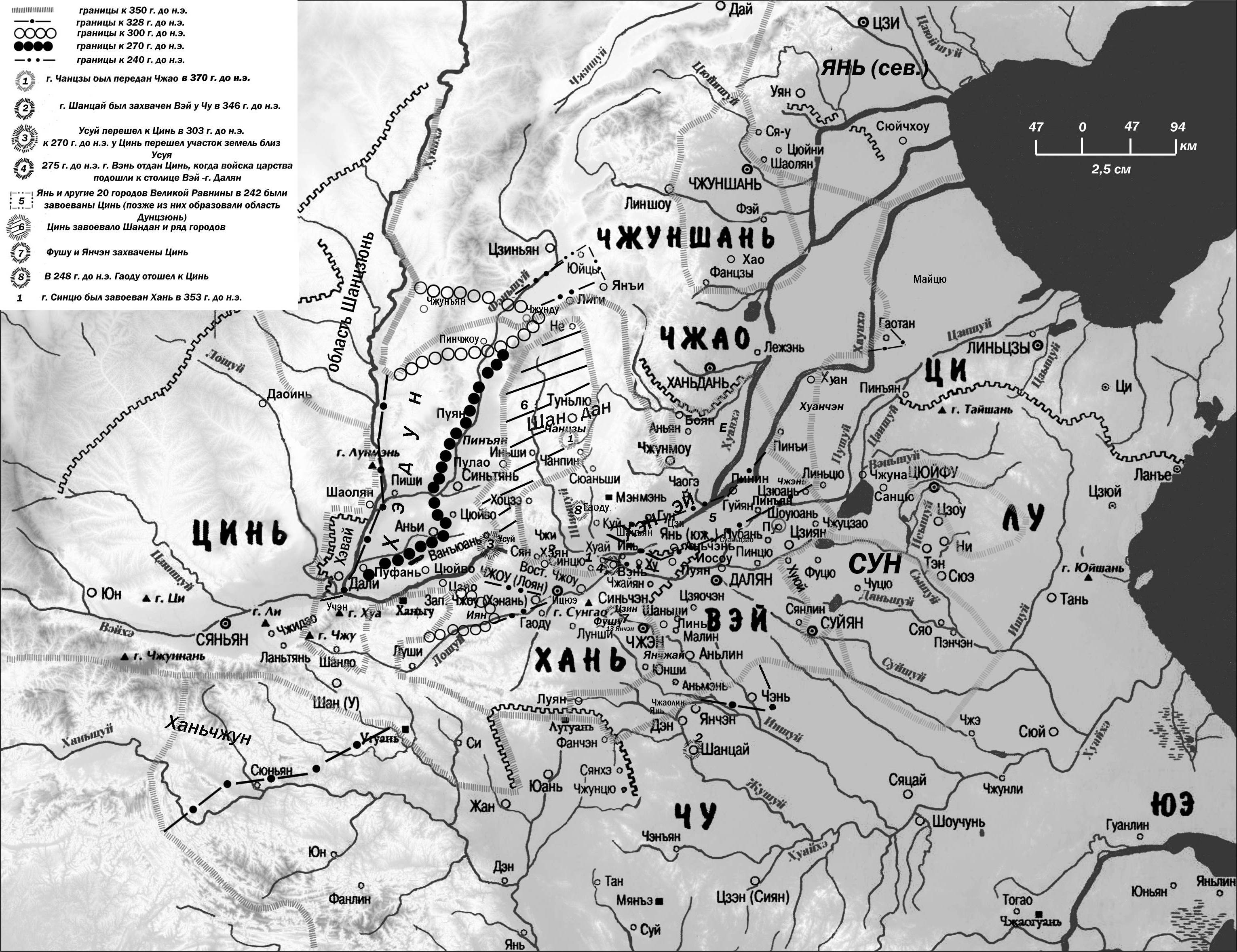 Рассмотрим вопрос об изменении границ царств Вэй, Чжао и Хань. Как уже говорилось, систематизировав историческую информацию о внешней и внутренней политике царств Великой китайской равнины, мы получили возможность обобщить имеющиеся сведения и совместить их с физической картой региона. Составление карт позволило нам не только увидеть неочевидные при прочтении источника особенности истории Вэй, Чжао и Хань, связанные с их территориальным положением, но и проследить завоевательную тактику царства Цинь и поэтапное поглощение им земель, ранее принадлежавших этим царствам.