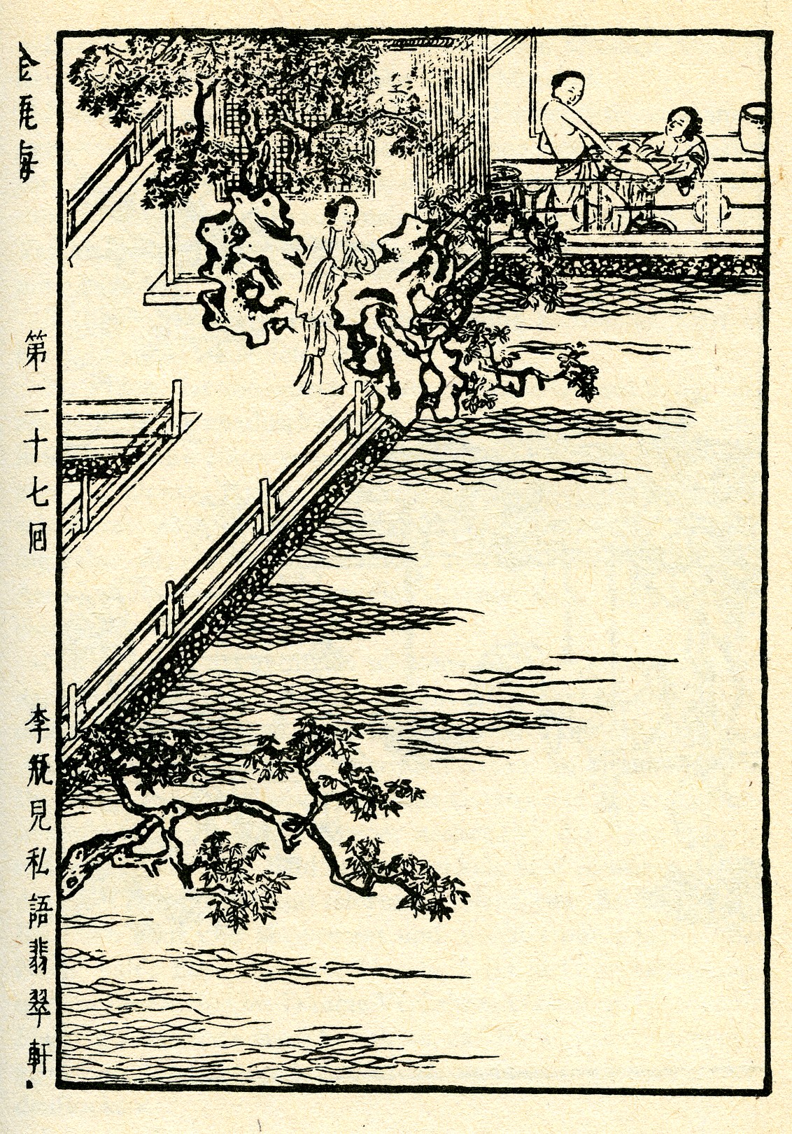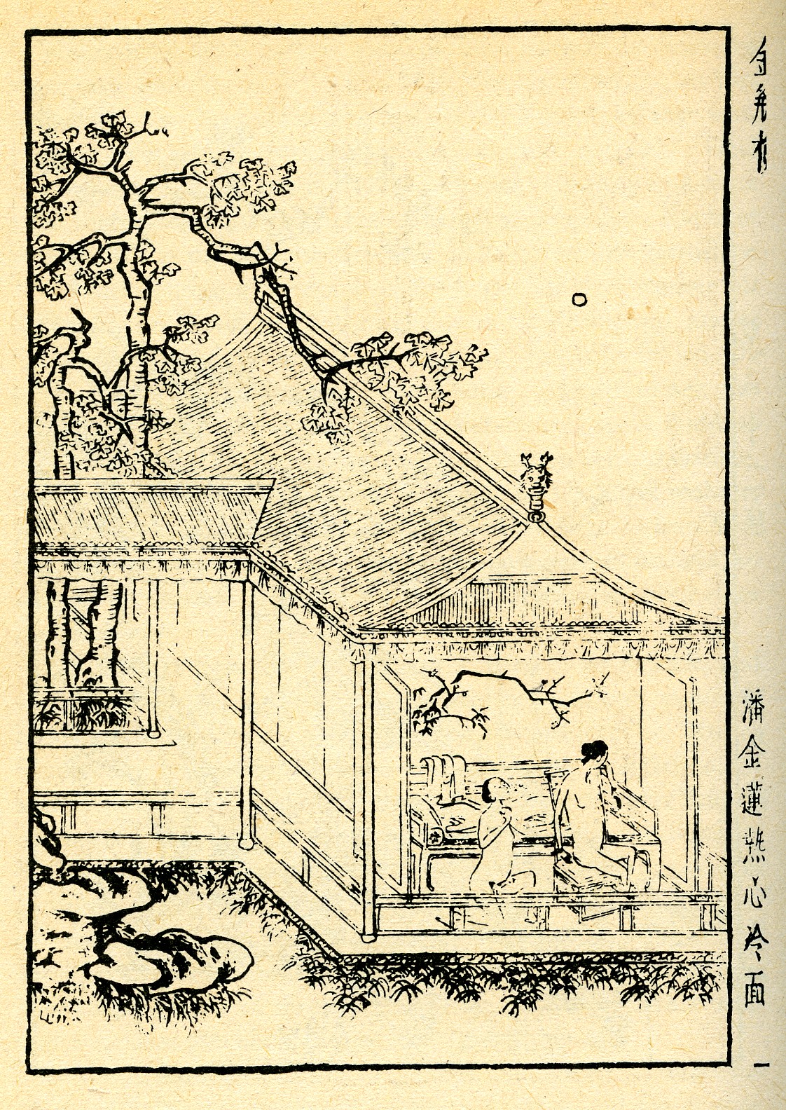 Иллюстрации к "Цзинь, Пин, Мэй", как и к другим китайским книгам того времени, - это типичная обрезная гравюра: на ней вырезано само изображение, а не фон - гравюра повторяет принцип ксилографической доски, с которой китайцы печатали текст книги.