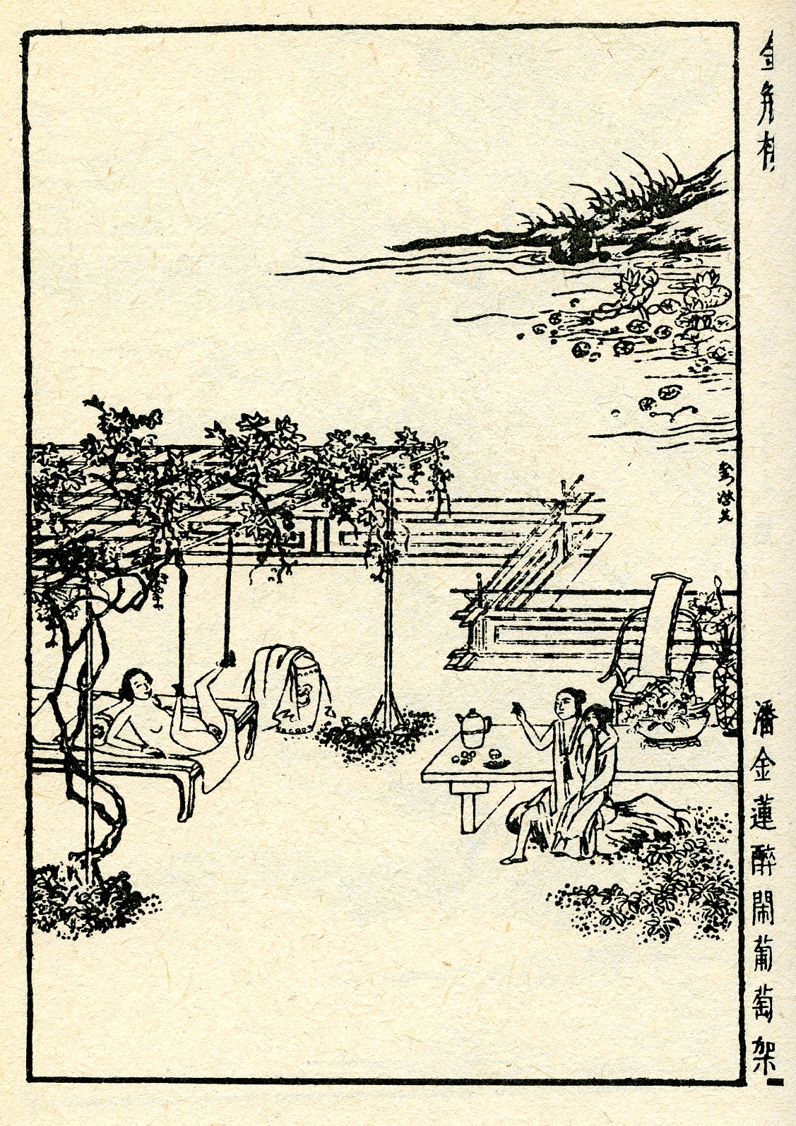 2-я илл. к гл. 27 с подписью Лю Ци-сяня: Пьяная Пань Цзинь-лянь томится в виноградной беседкеНа иллюстрациях ко 2, 4 и 35 главам к "Цзинь, Пин, Мэй" мы находим имя Хуан Цзы-ли. Известно, что это псевдоним известного мастера Хуан Цзянь-чжуна, в поздние годы сотрудничавшего со знаменитым художником Чэнь Хун-шоу (1598 - 1652) и пережившим его. Отсюда можно сделать вывод, что Хуан Цзы-ли был еще очень молод, когда участвовал в создании иллюстраций к нашему роману. Он был потомственным резчиком, его дед Хуан Ин-жуй создал иллюстрации к "Избранным пьесам эпохи Юань", а отец, Хуан И-бинь, вместе с другими сородичами прославился иллюстрациями к поэтическим сборникам. В 20-х годах XVII в. он создал гравюры к неоднократно упоминавшемуся "Западному флигелю". Резчиком был и дядя Хуан Цзы-ли, его имя связано с изданием портретов героев романа "Речные заводи", принадлежавщих Чэнь Хун-шоу. все страшие родичи Хуан Цзы-ли еще были живы и активно работали, когда он вырезал гравюру (или гравюры) и "Цзинь, Пин, Мэй".