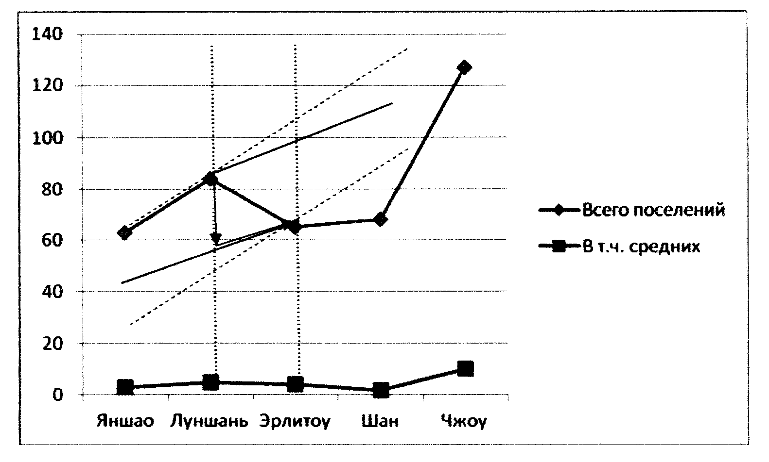 в конце Луншаня для района Ило.Иными словами, из 84 условных поселений Луншаня, после неких событий, на начальный этап Эрлитоу переходят не более 52–53 условных поселений (то есть, ок. 62–63% от имевшегося), и за всё время существования Эрлитоу количество поселений этой культуры возросло всего до 65 (т.е. до 77,38% от существовавших на этой же территории на этапе Луншаня). При этом исследовавшийся район был наиболее благоприятным для ведения всех видов хозяйственной деятельности, ибо находился в непосредственной близости от столицы династии Ся. Существовавшая при Луншане численность поселений в этом районе восстановилась и даже несколько возросла только во времена Чжоу – приблизительно через полторы тысячи лет после предполагаемой катастрофы в конце Луншаня, и после преодоления последствий шанского завоевания (отметим, кстати, что при Шан на данной территории, ставшей территорией по сути оккупированной, не только не наблюдается падения числа малых поселений, но имел место даже его некоторый рост, а вот число средних центров, обладавших, вероятно, определёнными административными функциями, снизилось по сравнению с Эрлитоу вдвое – с 4 до 2).