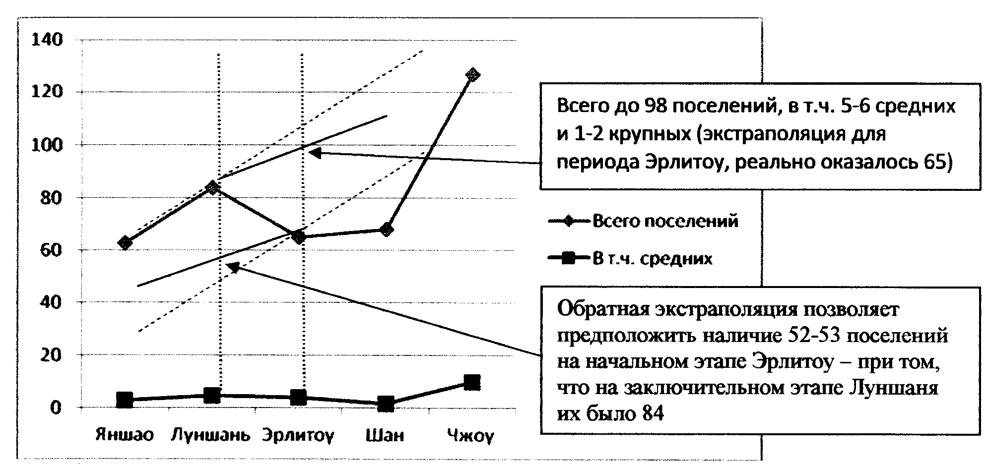 Данные по Эрлитоу учтены за всё время существования этого этапа, то есть упомянутые 77,38% – это максимум, достигнутый за всё время существования культуры Эрлитоу, поэтому логично будет предположить, что рост числа поселений этой культуры начинался с существенно меньшего их количества. Принимая темпы прироста населения (и, соответственно, темпы роста числа поселений) одинаковыми для Луншаня и Эрлитоу, получаем возможность провести обратную экстраполяцию, – разумеется, с корректировкой на вдвое меньшую продолжительность Эрлитоу, – что даёт нам ориентировочное количество в 52–53 поселения на начальном этапе становления Эрлитоу, это должно было привести со временем к созданию 65 реально существовавших в период Эрлитоу поселений (см.