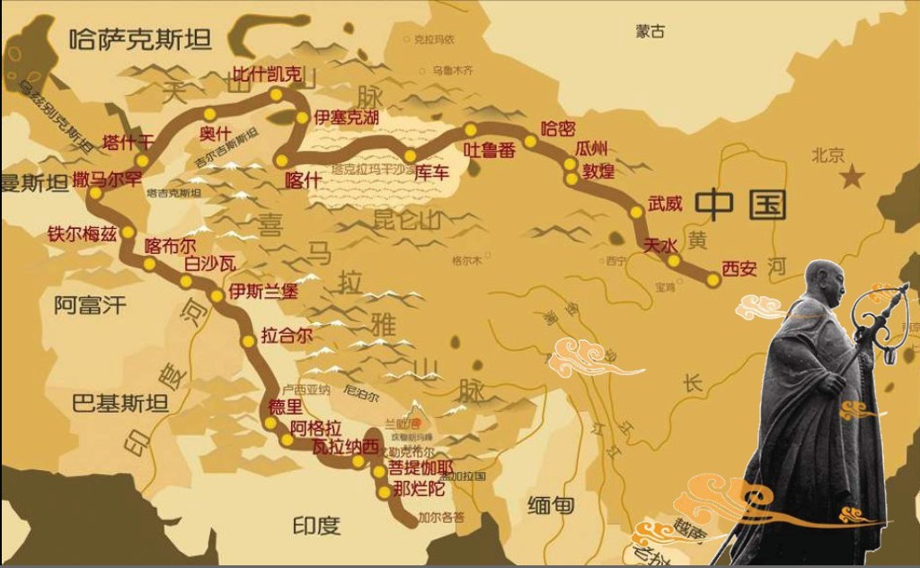 Путь Сюань-цзана в ИндиюСогласно описанию своего путешествия в «Дай Тан си юй цзи», Сюань-цзан шел в Индию протяженным обходным путем — через Среднюю Азию. Сначала он движется через сев. области Синьцзяна: Карашар (Ацини) — Куча (Цюйчжи) — Аксу (Балуцзя), — и далее поворачивает через перевалы Тянь-Шаня на север. «Это северные отроги Цунлина… Дороги опасны. Свирепствуют холодные ветры. Много неприятностей доставляют злые драконы (см.