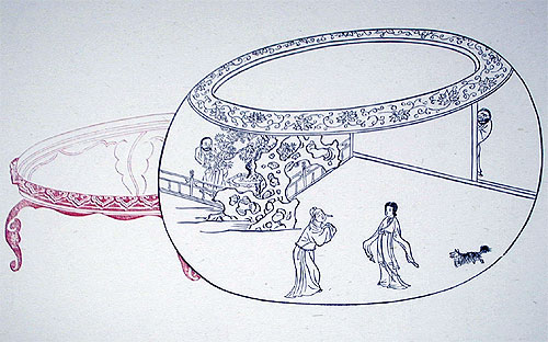 Минь Ци-цзи изобразил не только кульминационные сцены каждого акта драмы, но и заключил их в сложные композиции, состоящие из мотивов, отсутствующих в тексте. Сценки из пьесы с крайней изобретательностью вписаны художником в изображения вееров, фонарей, ширм, компаса, древних бронзовых сосудов, изделий из яшмы и фарфоровых ваз. Художник запечатлел на своих гравюрах-иллюстрациях целый мир вещей и предметов декоративно-прикладного искусства, окружавших образованного горожанина своего времени.