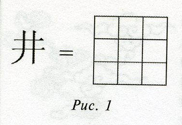 Рис.1«колодцем» (цзин [6]) называлась идеальная административно-производственная единица, территориальной основой к-рой якобы была система из девяти квадратных полей, взаиморасположение к-рых непосредственно изображает данный иероглиф цзин [6] (см.