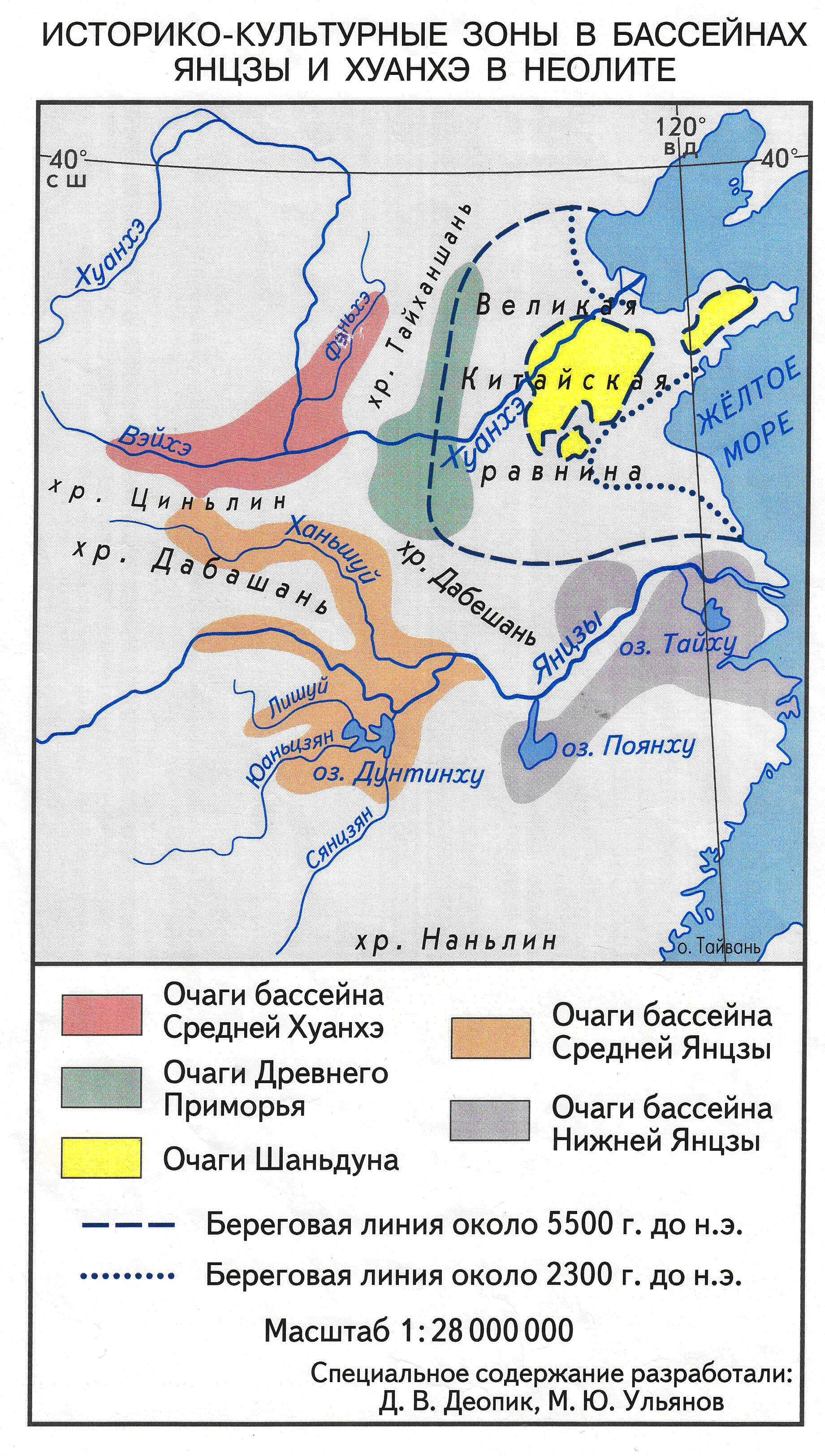 1. «Древнее Приморье» — земли к востоку от хребта Тайханшань и гор Суншань (включая их) вдоль древнего побережья к западу от «Древнего пролива», который отделял эту зону от Шаньдуна. Это именно «Приморье», поскольку к востоку от него на месте современной Великой Китайской равнины лежало море, пришедшее сюда ок. XVIII тыс. до н.э. в результате постледниковой трансгрессии вод мирового океана.