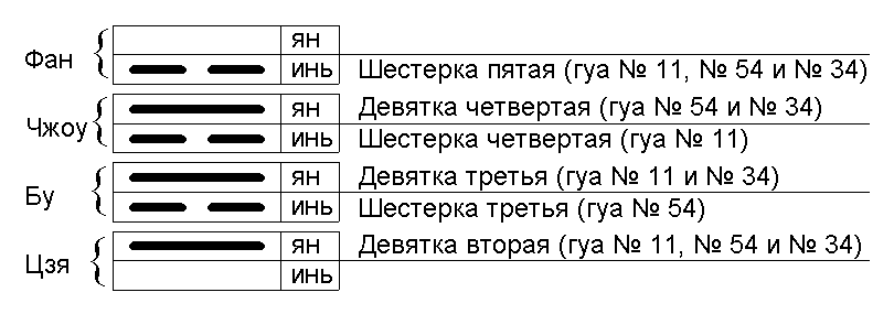 ГГ № 34 Да чжуан («Мощь великого»): φ I – № 34, № 43, № 14, шоу № 55; φ II – № 34, № 43, № 32, шоу № 55; φ III – № 34, № 43, № 55, шоу № 57; φ IV – № 34, № 43, № 54, шоу № 61; φ V – № 34, № 43, № 11, шоу № 73; φ VI – № 34, № 43, № 43, шоу № 55.