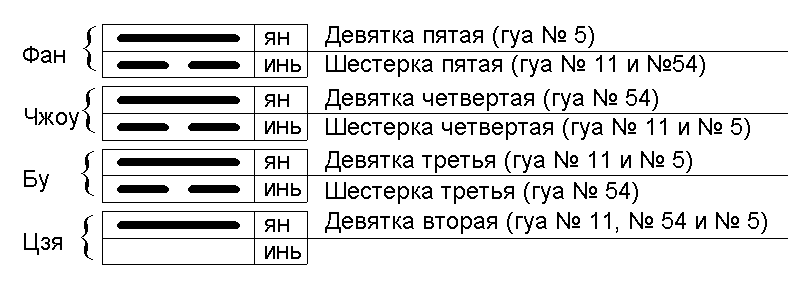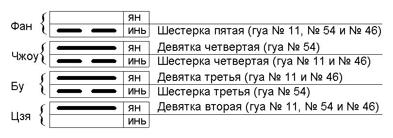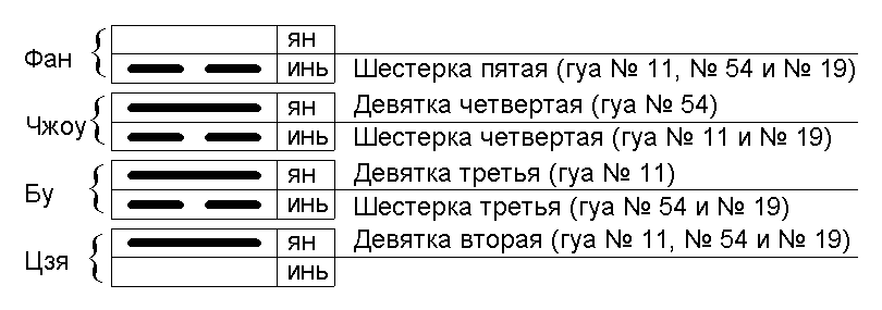 В каждом из уровней тетраграммы выделяем два подуровня. Верхний подуровень – ян, нижний – инь. Уровень фан, подуровень ян – заполняется непрерывными линиями/чертами, занимающими пятую позицию (Девятка пятая) в рассматриваемом множестве гуа. Уровень фан, подуровень инь – заполняется прерывистыми линиями/чертами, занимающими пятую позицию (Шестерка пятая). Аналогично происходит заполнение уровней чжоу, бу и цзя (см. рис 1–6). Если на каком-либо из уровней, рассматриваемых гуа, расположены однородные линии/черты, то заполняется только соответствующий им подуровень, второй подуровень остается незаполненным.