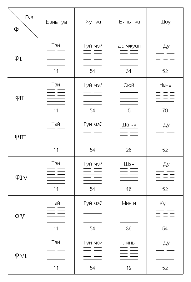 Φ VI: бянь гуа № 11 Тай, ху гуа № 54 Гуй мэй и бянь гуа № 19 Линь (см. Рис. 6). Ядра гексаграмм, образующихся во время трансформации Тай гуа в фазу VI –  обозначается при помощи тетраграммы № 52 Ду («Мера»).