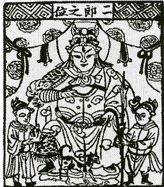 二郎神 Эр-лан-шэньЭр-лан-шэньБожество – второй сын; Эр-лан — Второй сын; Гуанькоу Эр-лан – Второй сын из Гуанькоу; Гуанькоу-шэнь — Божество из Гуанькоу. В поздней китайской народной мифологии одно из божеств вод, а также дамб, защищающее людей от разливов рек и наводнений. По наиболее распространенной версии, Эр-лан — сын сычуаньского правителя Ли Бина, усмирявшего воды, прокладывавшего новые русла рек и боровшегося с драконом (лун). Если предания о Ли Бине с сильной мифологической окраской зафиксированы с первых веков н.э., то имя Эр-лан появляется в письменных памятниках лишь с XII в. По предположению китайского фольклориста Хуан Чжи-гана, образ самого Ли Бина трансформируется в этот период в образ его сына (не исключено, что первоначально Эр-ланом назывался Ли Бин, в нек-рых памятниках упоминаются Ли Бин и его сын). Постепенно культ Эр-лана как сына Ли Бина затмевает или почти вытесняет культ отца, ему же в преданиях приписываются подвиги, аналогичные подвигам Ли Бина. Храмы Эр-лана были построены вдоль всего течения Янцзы. В них он изображался молодым человеком свирепого вида с третьим глазом на лбу. Согласно местному поверью, этот глаз обычно закрыт и открывается лишь во время битвы, придавая Эр-лану воинственный вид. У Эр-лана темное лицо, красные волосы. Ему во множестве приносили в жертву  баранов. Образ Эр-лана встречается и в лит-ре, напр. в фантастических эпопеях «Си ю цзи» («Путешествие на Запад») У Чэн-эня (XVI в.) и «Сы ю чжуань» («Повествование о четырех путешествиях») Ян Чжи-хэ (XVI в.). Именем Эр-лана называют и Лао-лана, а также др. персонажей.