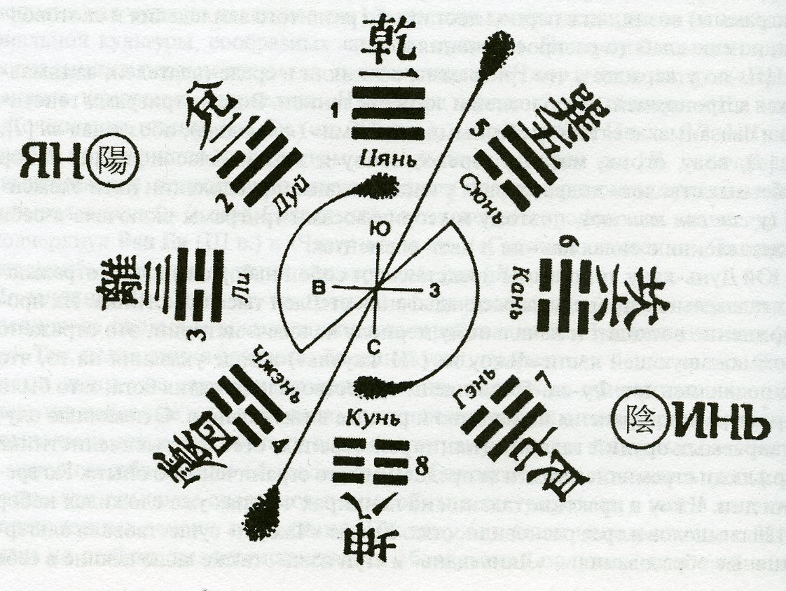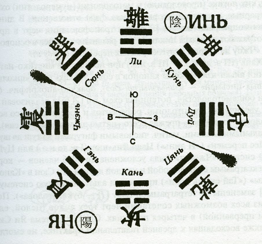 тай цзи). Однако исторически гексаграммы могли возникнуть раньше триграмм. В статическом плане каждый из наборов — восемь триграмм и 64 гексаграммы — зафиксирован в двух пространственно ориентированных расположениях, приписываемых Фу-си и Вэнь-вану, основателю династии Чжоу (XI–III вв. до н.э.). Последнее реализовано в тексте канонич. части «Чжоу и». Последовательная смена черт гуа [2] в расположении Фу-си, реально проявившемся значительно позже (прежде всего в трудах основателей