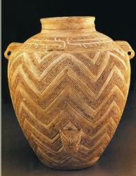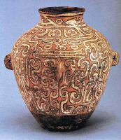 Западнояншаоская керамика. Ангоб, роспись. Культура Мацзяяо. 3300-2000 гг. до н.э.Искусство росписей по керамике достигло своего наивысшего расцвета в верхних слоях Западного Яншао (IV–III тыс. до н.э.). По мере эволюции были освоены многочисленные варианты узоров: геометрический, растительный орнаменты, а также изображения растений, животных и людей. Геометрический орнамент представлен в общей сложности более чем 20 разновидностями узоров и отдельных элементов. Среди них — точечный узор, образованный точками различных конфигураций и крючками; узор из полос (горизонтальных, косых, вертикальных, волнистых, зубчатых, зигзагообразных и дугообразных); комбинации простейших геометрических фигур (кругов, колец, ромбов, треугольников, дуг); зигзаги (например, «молния» и «лестничный» узор); спиралевидные мотивы (S-образная и С-образная спираль и производные от них графические комбинации); кресты (четырехконечный, двойной, свастика); сложносоставные узоры («сетки», «решетки», «шахматы», «меандры»). В яншаоском орнаментально-графическом искусстве были выработаны также особые оформительские принципы, устанавливающие четкую связь между формой и декором сосуда, и найдены стандартные графические решения, сводящиеся к симметричной или асимметричной группировке элементов узора. В результате орнаментальное поле изделия превращалось в замкнутую и самодостаточную художественную структуру, отмеченную ритмическим единством всех ее компонентов. Указанные семиотические закономерности росписей были рассчитаны на достижение заранее прогнозируемого зрительно-сенсорного эффекта, что дает основания рассматривать яншаоскую расписную керамику в качестве полноценного художественного явления, свидетельствующего о зарождении в неолитическом гончарстве эстетических основ, унаследованных более поздним китайским искусством.