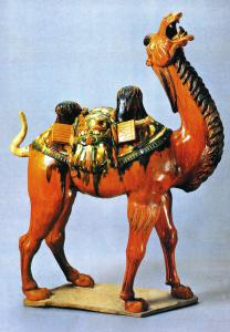Верблюд (погребальная пластика). Керамика, трехцветная глазурь. Эпоха ТанТрадиция расписной керамики продолжила свое существование в эпоху Тан, во многом благодаря работе мастерских Цычжоу-яо, в которых тогда выпускалась в основном т.наз. популярная керамика (