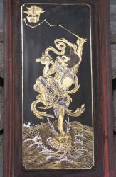 Бэй-доу). Изображается с синим лицом и красными волосами, стоящим на правой ноге, левая — согнута в колене, отведена назад и приподнята. В правой руке — кисть, в левой — казенная печать или ковш Большой Медведицы. Единственная одежда — повязка вокруг бедер и развевающийся шарф на шее. Часто изображается стоящим на спине огромной рыбы