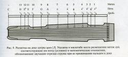 Цитра циньХарактерной особенностью цитры цинь [3] является отсутствие ладов и такая разметка деки, которая, по сути, их заменяет и соответствует главным акустическим узлам, возникающим при колебаниях струны. В настоящее время известно, что при колебании струны звучат различные гармоники, т.е. призвуки, в совокупности с основным тоном имеющие частоты, которые находятся в отношении натурального ряда чисел (1:2:3:4:5 и т.д.) и образуются за счет колебаний соответствующих отрезков струны. На струне имеются как пункты, в которых вибрации этих гармоник отсутствуют – узлы, так и пункты, в которых они имеют максимальную амплитуду – пучности. Похоже, что создатели цитры цинь [3] знали об этом. Для разметки деки используются перламутровые или костяные кружочки хуй, вмонтированные в корпус рядом с самой толстой струной (рис. 9). Этих кружочков 13, их счет ведется справа налево, и расположены они строго симметрично относительно центра. Хуй обозначают отрезки струн, выражаемые дробями от