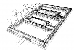 Реконструкция дворцового комплекса в ПаньлунчэнРеконструкция дворцового комплекса в Паньлунчэн. Приводится по: [9. т. 1, с. 644]. Остатки ещё восьми небольших жилищ найдены за пределами городища. Они разные по устройству (наземные на фундаменте и полуземлянки) и по размерам (от 16,5×6,5 до 5,6×2,8 м). Выявлено много канав, очевидно, производственного назначения, заполненных золой, древесным углём и фрагментами керамических тиглей.
