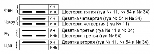 ГГ № 34 Да чжуан («Мощь великого»): φ I – № 34, № 43, № 14, шоу № 55; φ II – № 34, № 43, № 32, шоу № 55; φ III – № 34, № 43, № 55, шоу № 57; φ IV – № 34, № 43, № 54, шоу № 61; φ V – № 34, № 43, № 11, шоу № 73; φ VI – № 34, № 43, № 43, шоу № 55.
