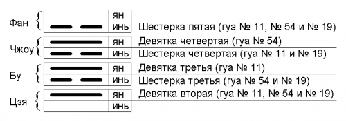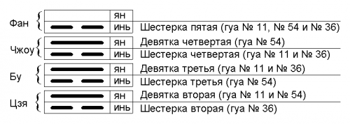 В каждом из уровней тетраграммы выделяем два подуровня. Верхний подуровень – ян, нижний – инь. Уровень фан, подуровень ян – заполняется непрерывными линиями/чертами, занимающими пятую позицию (Девятка пятая) в рассматриваемом множестве гуа. Уровень фан, подуровень инь – заполняется прерывистыми линиями/чертами, занимающими пятую позицию (Шестерка пятая). Аналогично происходит заполнение уровней чжоу, бу и цзя (см. рис 1–6). Если на каком-либо из уровней, рассматриваемых гуа, расположены однородные линии/черты, то заполняется только соответствующий им подуровень, второй подуровень остается незаполненным.