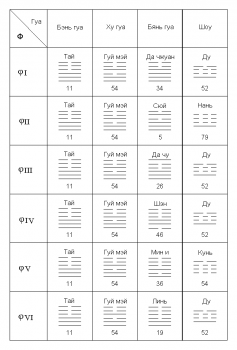 Φ VI: бянь гуа № 11 Тай, ху гуа № 54 Гуй мэй и бянь гуа № 19 Линь (см. Рис. 6). Ядра гексаграмм, образующихся во время трансформации Тай гуа в фазу VI –  обозначается при помощи тетраграммы № 52 Ду («Мера»).