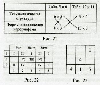 табл. 8, здесь обнаружилась текстологическая структура {9 × 5}, в которой иероглифы занимают 39 клеток из 45. В этих троичных конструкциях естественно представление 39 в виде 13 × 3. Т.о., структура {9 × 5} заполнена текстом по формуле 13 × 3, что вновь свидетельствует о нумерологической взаимосвязи 9 и 13 (см. также