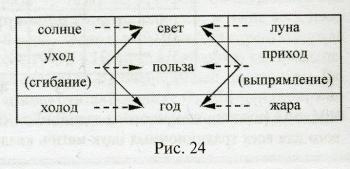 Табл. 16 показывает три операции по получению из четырех понятий пятого. Все операции объединяет пара понятий – «уход» и «приход», но третья операция отличается от первых двух тем, что в ней пары понятий взаимоотождествляются, а не образуют «в перекрест» четыре возможные парные комбинации. Графически эти связи внутри понятийной системы, вписывающейся в девятиклеточный квадрат 3 x 3, представлены на