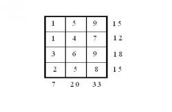рис. 12 видно, что в среднем сумма 3-членной строки равна 15, а 4-членного столбца – 20. Отсюда вытекает, что если столбцы соответствуют 3 видам черт, а строки – их 4 позициям в тетраграммах, то все тетраграммы в числовом выражении дадут сумму, равную 1620 (20×81 или 15×108, где 108 – количество черт одного вида)