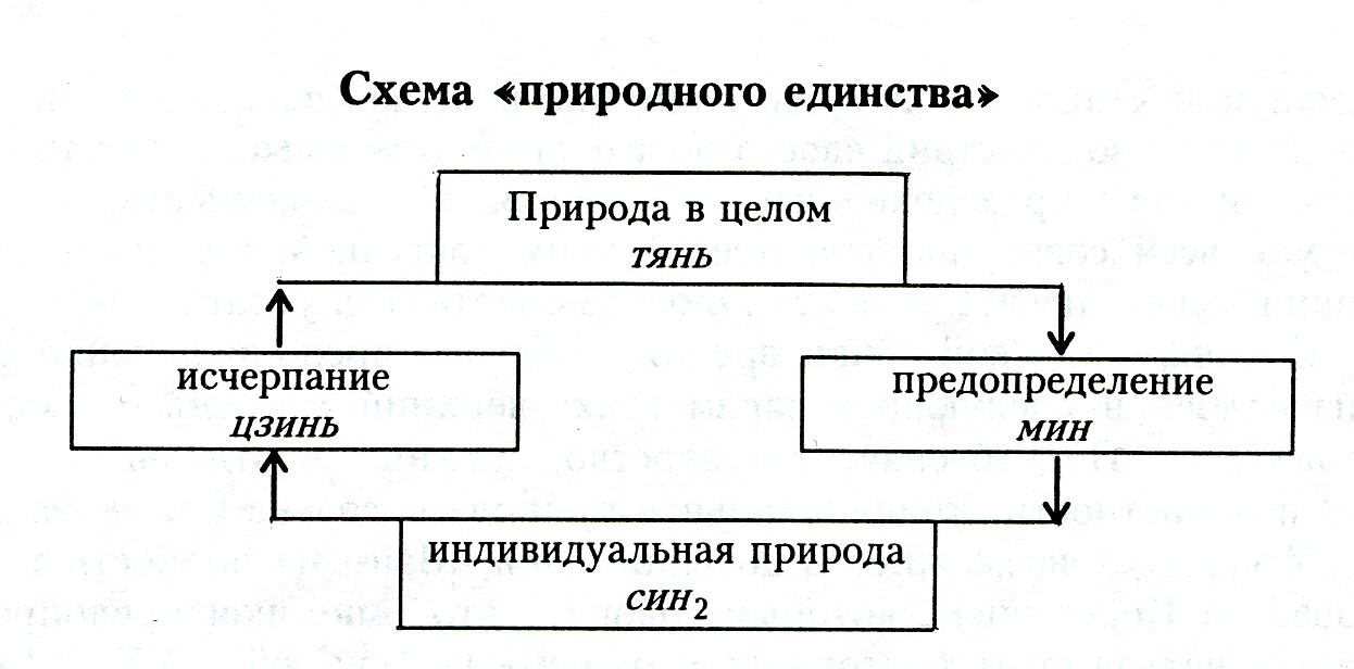Последователи Конфуция, основываясь на принципе гомоморфизма макрокосма и микрокосма, осмыслили возможность познания и изменения человеком своей собственной природы как возможность познания «неба» и влияния на него: «Знающий свою природу знает небо» (Мэн-цзы», VII А, 1 [475, т. 2, с. 301]; ср. [67, т. 1, с. 246]); «Способный исчерпывающе [раскрыть] свою природу... может войти в триединство с небом и землей» («Чжун юн», § 22 [331, т. 7(25), с. 2137]; ср. [67, т. 2, с. 129]). Причем под «исчерпывающим раскрытием» подразумевалось совершенное знание истинной природы и вполне адекватное этому знанию поведение. Таким образом, в трактовке первых конфуцианцев путь к воздействию на природу в целом (тянь — «небо») лежал через воздействие на индивидуальную природу (син2). И, следовательно, две формулы из «Чжун юна» и «Чжоу и», приведенные в начале рассуждения о предопределении, описывают два вида противоположно направленных связей между природой в целом и индивидуальной природой. Эту замкнутую круговую систему можно представить с помощью следующей схемы: