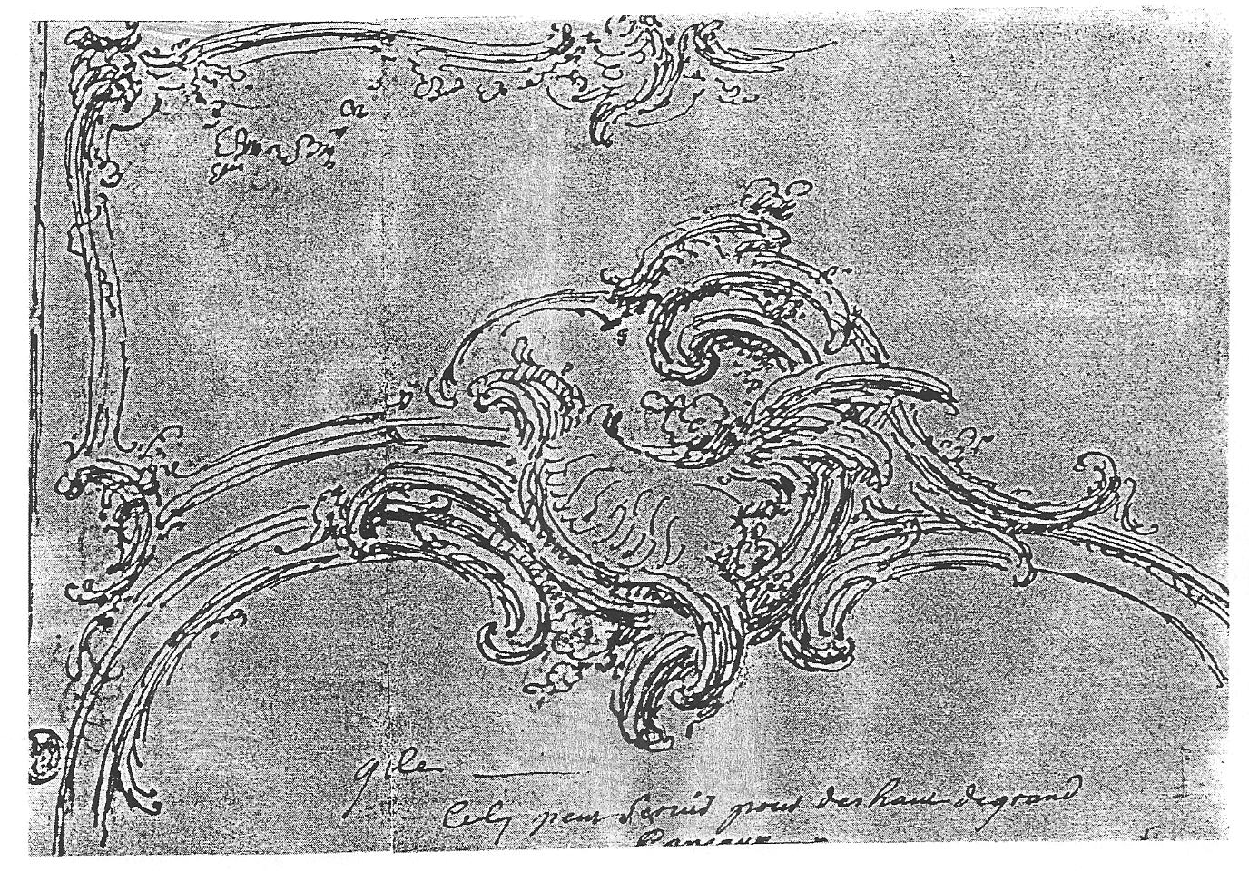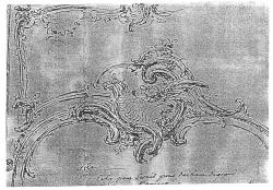 Вместе с тем, в дворцовых изделиях середины XVIII в. применялось значительное число новых западных форм и сюжетов росписи. Император Цяньлун в начале своего царствования проявлял больше интереса к европейскому искусству, нежели даже его предшественники. Самым выразительным свидетельством тому было, конечно, строительство дворца в «западном» стиле, предпринятое по августейшему указу в комплексе Юаньминъюань (см. Часть 2, Главу 2). Те же тенденции наблюдаются в дворцовых эмалях этого правления, в росписи которых распространяются европейские жанровые и пейзажи сцены (Ил. 213, 214), имеющие определенное сходство с произведениями рококо. Цвет в пекинских живописных эмалях периода Цяньлун обычно соответствует реальной природе тех или иных объектов изображения. Применяются иллюзионистические эффекты передачи объемности предметов и тел, пространственной перспективы, «глубины» небес (при помощи светотеневой моделировки и штриховки [160, № 104-106, 212, 215, 223, 233]). Это явилось следствием влияния росписи западных эмалей (которые в виде посольских даров поступали в Пекин и затем копировались придворными мастерами), с одной стороны, и, с другой стороны, результатом работы при пекинском дворе европейских живописцев – Дж. Кастильоне и Ж.-Д. Аттире, создавших на китайской почве особый вариант компромиссного цинского стиля, родственного западным версиям шинуазри, однако, отмеченного преобладанием в нем китайских компонентов. Введенная этими художниками в цинское придворное искусство западная концепция перспективы и светотени приобрела популярность в расписных эмалях дворцовых мастерских. Светотень накладывалась «отмывкой» цветов или при помощи нанесения штрихов (обычно в виде точек – техника, которая была заимствована пекинскими художниками из западных живописных эмалей XVII –XVIII веков [160, № 223, 209], Ил.197). Такие эффекты в росписи были достижимы лишь при условии применения непрозрачных красителей. Возможно, это обстоятельство служит объяснением того примечательного факта, что прозрачные материалы были к середине XVIII века полностью исключены даже в технике клуазонне. В результате адаптации европейских приемов сюжеты, связанные с национальной историей, китайские жанровые композиции, изображения китайских красавиц, цветов и птиц в пекинских (и, вслед за ними, кантонских) эмалях периода Цяньлун тоже стали, по определению исследователей, чаще исполняться в новой – «западной», а не в прежней – «китайской» манере. Анализ материала позволяет в действительности определять эту новую манеру как признак придворной «китайщины» периода Цяньлун. Характерным образцом может служить находящийся в дворцовом собрании аквариум (или кашпо) в форме чана, который украшен жанровыми сценами в рокайльных картушах, включающих изображения в духе Кастильоне китайских пастушек с козочками на фоне китайского же горного пейзажа, однако с низкой линией горизонта и западным «кулисным» построением композиции. В обрамлениях картушей и орнаментальных клеймах между ними применен стилизованный узор в виде облаков и драконов куй 夔 [160, № 233] (Ил.215). Ил.216. Н. Пино. Эскиз навершия рамы. Бумага, рисунок пером. Франция, вторая четверть XVIII в. [127 , ил. 44].В дворцовых эмалях правления Цяньлун форма картушей со сложными тщательно проработанными рамами часто приближается к французски