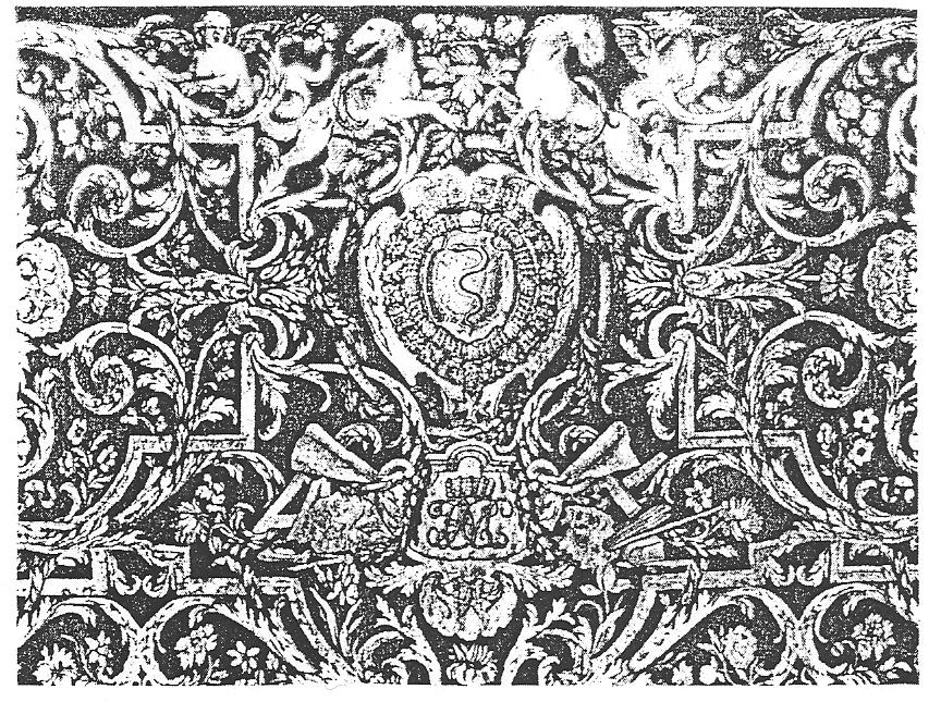 Ил.221. Композиция ковра с барочным растительным декором и гербами Кольбера в картушах. Мануфактура Савонери, Франция, вторая половина XVII в. [16, № 46].Такова находящаяся в собрании Государственного музея Востока (ГМВ, Москва) группа медных тарелок, отделанных в перегородчатой технике [98, с. 135 –138] (Ил.222-224). В композициях вещей заметна трансформация принципов французского искусства второй половины XVII века: очевидно общее сходство предметов из московского собрания с декором руанских фаянсовых тарелок, в которых сочетаются компактные орнаментальные элементы растительного характера и ажурные решетки, помещенные у краев на равном расстоянии от центра [15, с. 66, ил. 50]; по набору и расположению узоров перегородчатые эмали из ГМВ составляют близкую аналогию композиции ковра, вытканного на мануфактуре Савонери и украшенного гербом Кольбера [16, с. 79] (Ил.221).