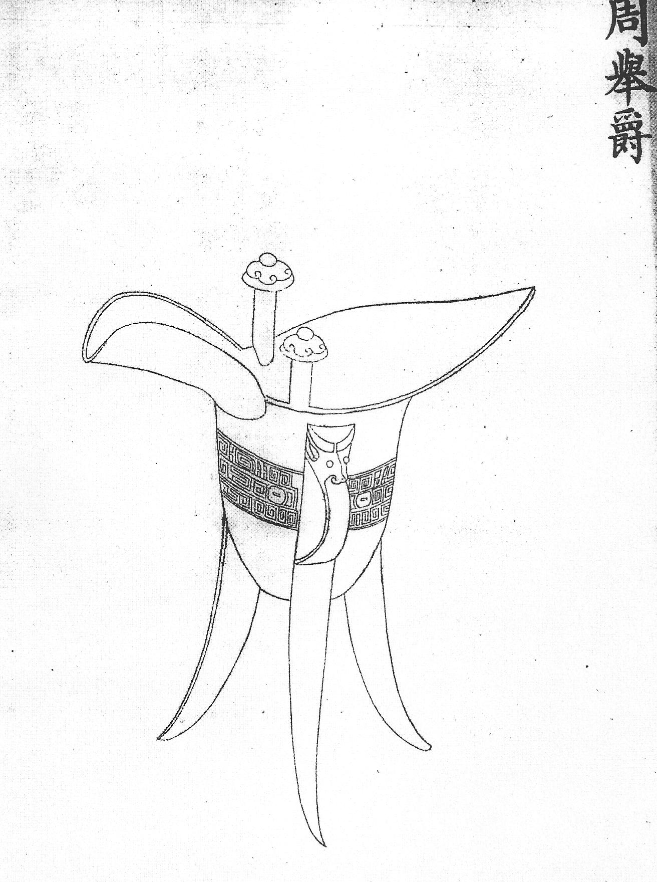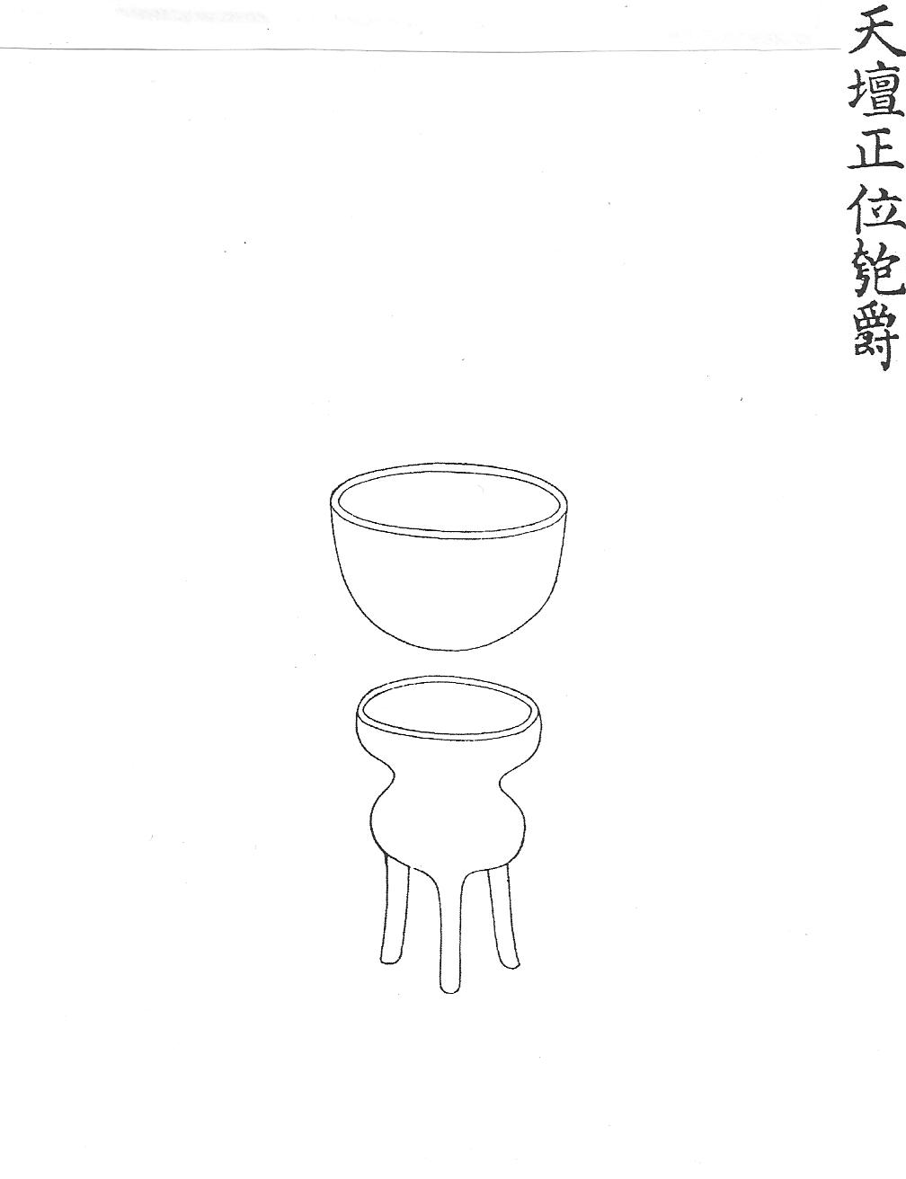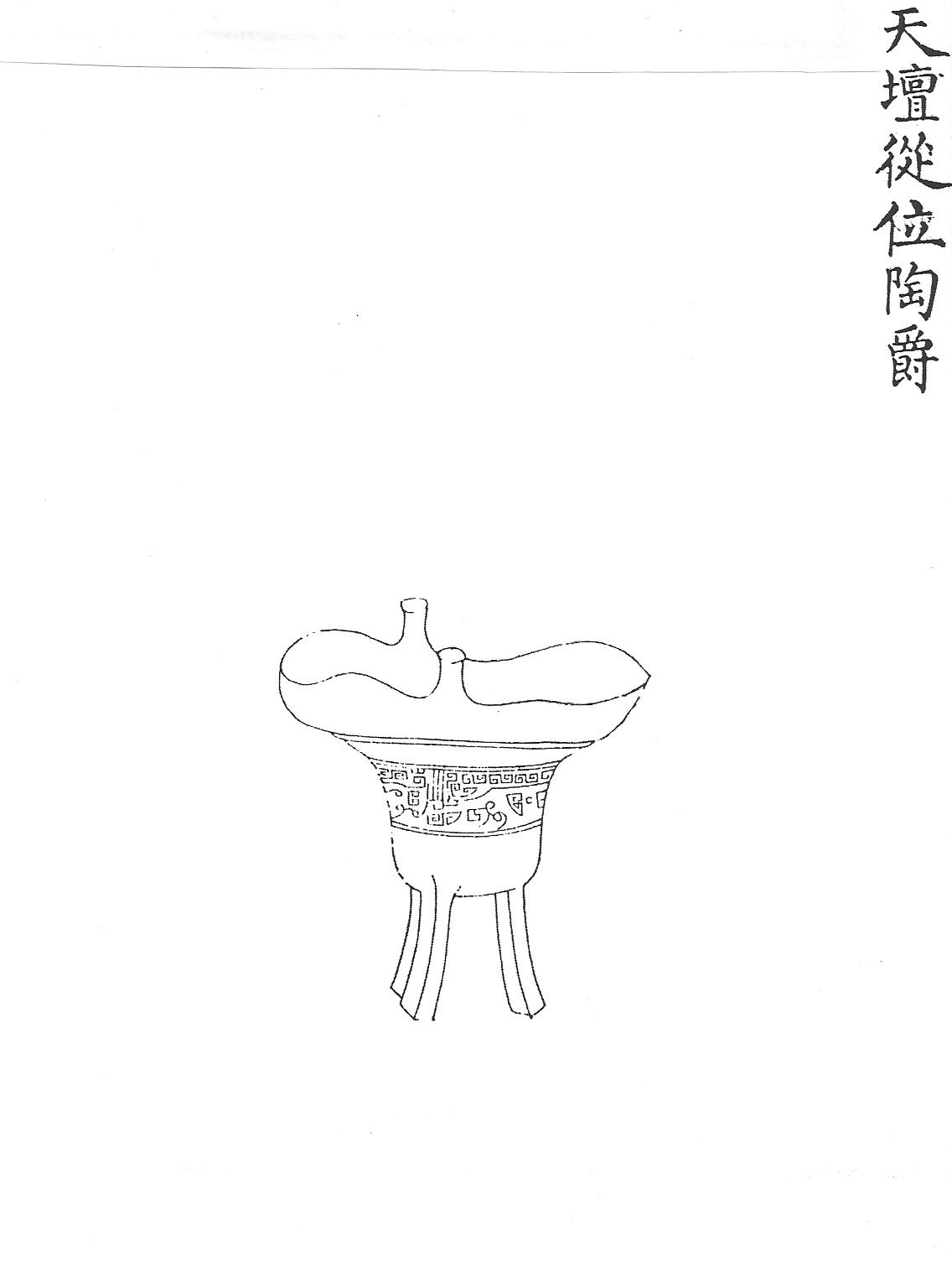 Паоцзюэ – кубок цзюэ на трех высоких ножках, Ил.1. Ритуальный сосуд паоцзюэ для жертвоприношений в храме Неба Тяньтань. Гравюра сборника иллюстраций цинской ритуальной утвари Хуанчао лици туши [158, т.1, с.2]. с туловом в виде двойной тыквы хулу (Ил.1, см.: [158, т. 1, с. 2]). Тип винного сосуда цзюэ появился в наборе китайской ритуальной утвари в эпоху Шан и вышел из употребления в эпоху Западная Чжоу. Форма тулова этого ритуального кубка является нововведением маньчжурского времени.