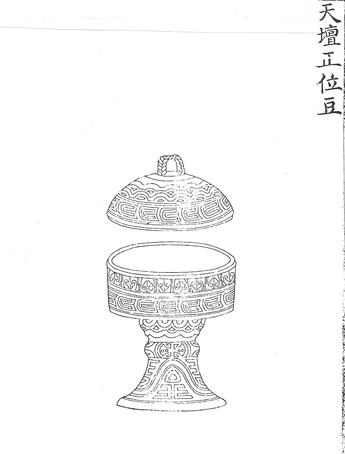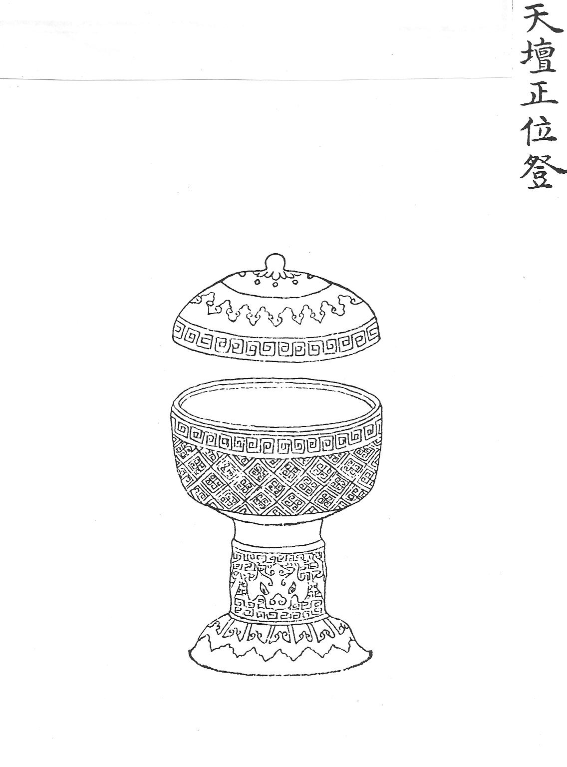 Дэн – сосуд с крышкой и глубоким округлым туловом, покоящийся на высокой ножке (Ил.2, см.:[158, т. 1, с. 4]). Ил.2. Ритуальный сосуд дэн для жертвоприношений в храме Неба Тяньтань. Гравюра сборника Хуанчао лици туши [158, т.1, с.4].Тип округлой чаши с крышкой, установленной на высокой (иногда низкой) ножке, был излюбленным в китайской керамике, начиная с эпохи неолита, и это также часто повторяющаяся форма в керамике и бронзе в течение всей древнекитайской истории. В четырехтомном китайско-русском словаре дэн трактуется как «ритуальный кувшин из глины или бронзы для жертвенной пищи или питья» [22, т. 2, № 918]. В целом дэн близок другим принятым в ритуале цинского времени типам резервуаров для жертвенной пищи – доу и гуй.