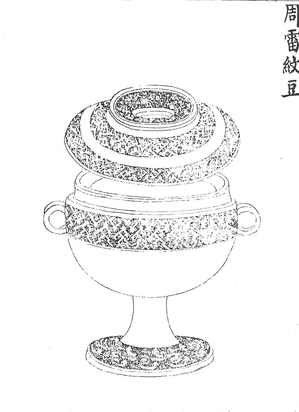 Ил. 7. Ритуальный сосуд доу для жертвоприношений в храме Неба Тяньтань. Гравюра сборника Хуанчао лици туши [158, т.1, с.8].В древних надписях на гадательных костях есть иероглиф «доу», который выглядит как росток риса, расположенный в верхней части сосуда, поддерживаемого двумя руками за дно. Ил. 8. Ритуальный бронзовый сосуд доу. Эпоха Чжоу. Гравюра каталога Циньдин Сицин гуцзянь [167, т. 29, c. 27].Позднее упрощенный иероглиф, обозначающий тот же самый тип сосуда для жертвенной пищи, можно видеть в комментариях к древним керамическим и бронзовым предметам в старых каталогах и классификациях. Такая система определения различных сосудов, приспособленная в первую очередь для древних пользователей, по справедливому мнению некоторых китайских исследователей, является в то же время ключом к пониманию назначения вещей [191, c. 317-318, рис. 1а]. Сосуды этого типа, отнесенные придворными экспертами к периоду Чжоу, опубликованы в каталоге императорской коллекции древней бронзы (Ил.8, см.:[167, т. 29, с. 27]).
