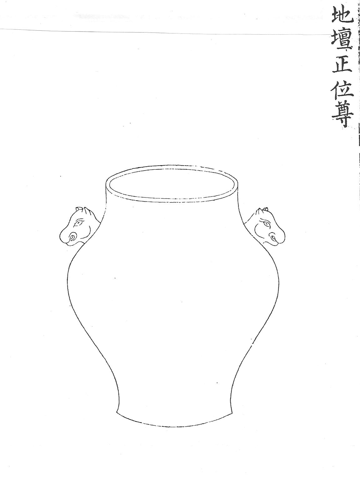 Цзунь – сосуд, который использовался в ритуале маньчжурского Ил.9. Ритуальный сосуд цзунь для жертвоприношений в храме Земли Дитань. Гравюра сборника Хуанчао лици туши [158, т.1, с.11, 30].времени при жертвоприношениях во всех храмах государственного значения. Винный контейнер цзунь, применявшийся в храмах Неба (Тяньтань) и Земли (Дитань), значительно отличался по форме от ритуальных сосудов данного типа, бытовавших в храме императорских предков (Таймяо). В первом случае сосуд имел форму вазы с широким округлым туловом, слегка сужающимся к ножке и горлу, с двумя боковыми ручками на плечах в виде головок лошади, тотемного животного у маньчжуров (Ил. 9, см.:[158, т. 1, с. 11, 30]).