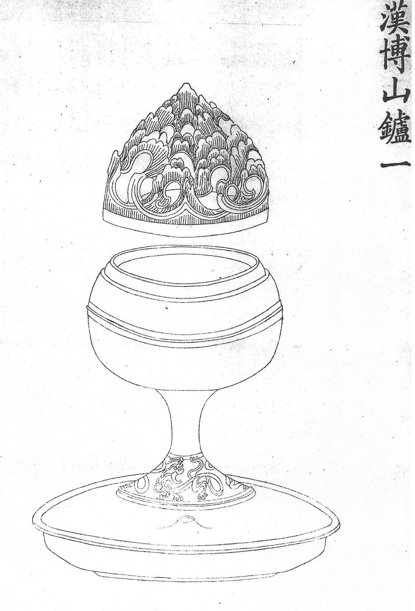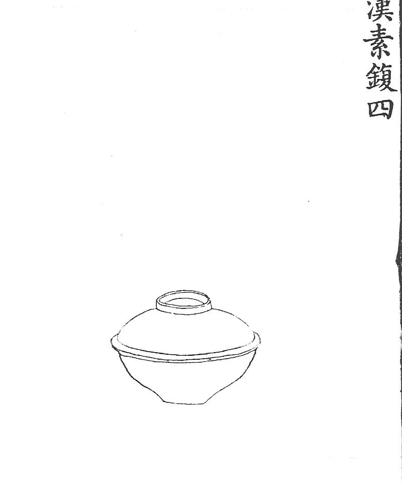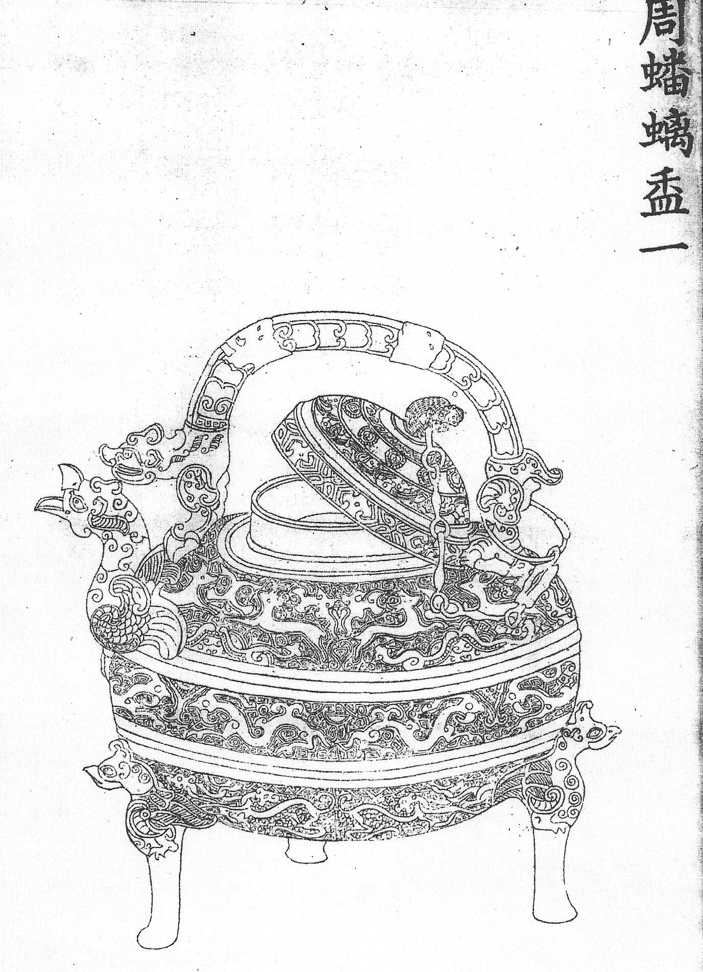 Ил.19. Бронзовая чаша с крышкой. Эпоха Хань. Гравюра каталога Циньдин Сицин гуцзянь [167, т. 31, c. 29].По общему мнению современных исследователей, своего расцвета искусство бронзового литья в Китае достигло к середине династии Шан, когда сформировались многие типы жертвенных сосудов и мотивы их декора, унаследованные и преобразованные чжоуским ритуальным искусством. С периода Чжаньго в бронзе наблюдается постепенное формирование принципиально новой художественной концепции, достигшей своего предельного выражения в вещах эпохии Хань. Уже в изделиях периода Чжаньго широкое распространение получила техника инкрустации бронзы драгоценными металлами, самоцветами и стеклом, нарушившая строгую монохромность ритуальных вещей. Ханьские предметы, как это видно на примерах из императорской коллекции, окончательно утрачивают подавляющую монументальность ранней ритуальной бронзы и, даже копируя ее, остаются светскими по духу и удобными в употреблении, поскольку во многих случаях они предназначены уже для повседневного быта (см.:[167, т. 38, c. 31, 34; т. 21, c. 19; т. 22, c. 9, 26; т. 31, c. 29], Ил. 19).