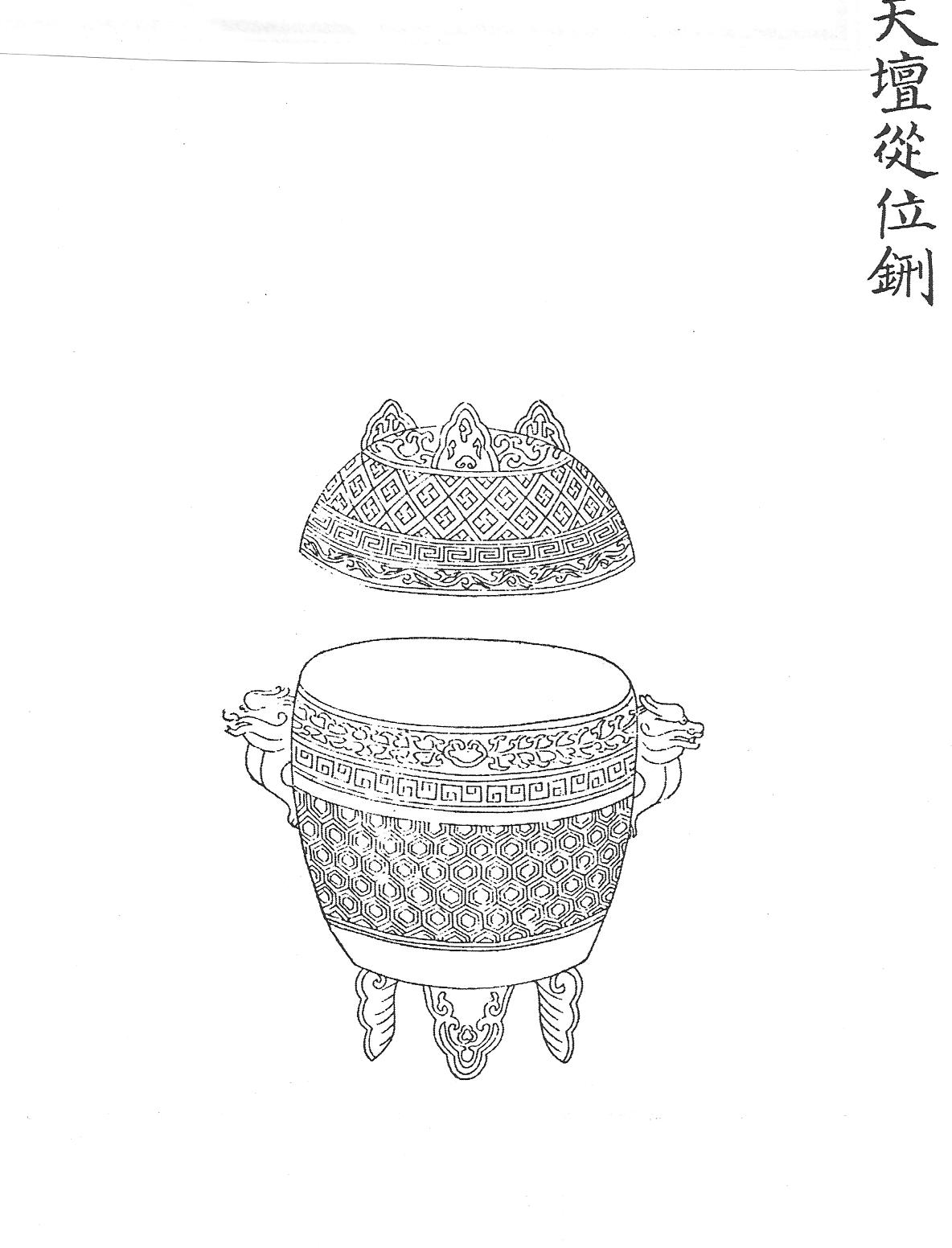 Ил. 14. Ритуальный сосуд син (дин) для жертвоприношений в храме Неба Тяньтань. Гравюра сборника Хуанчао лици туши [158, т.1, с.14].Жертвенный сосуд син, который в цинский период использовали при наиболее ответственных жертвоприношениях в главных храмах империи, является разновидностью треножника дин, применявшегося в государственном ритуале с древности (Ил. 15, 16, см.: [167, т. 3, с. 5,15]). Маньчжурские императоры не могли обойти вниманием этот тип предмета ввиду его особой значимости для китайской культуры. Иероглиф «дин» в качестве названия пятидесятой гексаграммы древней Книги перемен (Ицзин), имеет значение «жертвенник». Жертвенный треножник неизменно существует в традиционной культуре как символ незыблемости императорской власти (динцзо) и судьбы страны (динмин). Согласно надписям на древней бронзе треножники дин часто составляли комплект из нескольких сосудов.