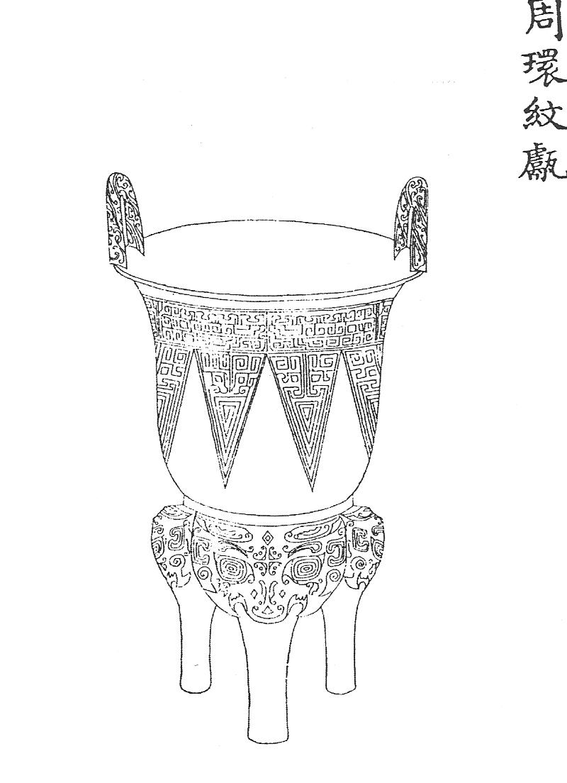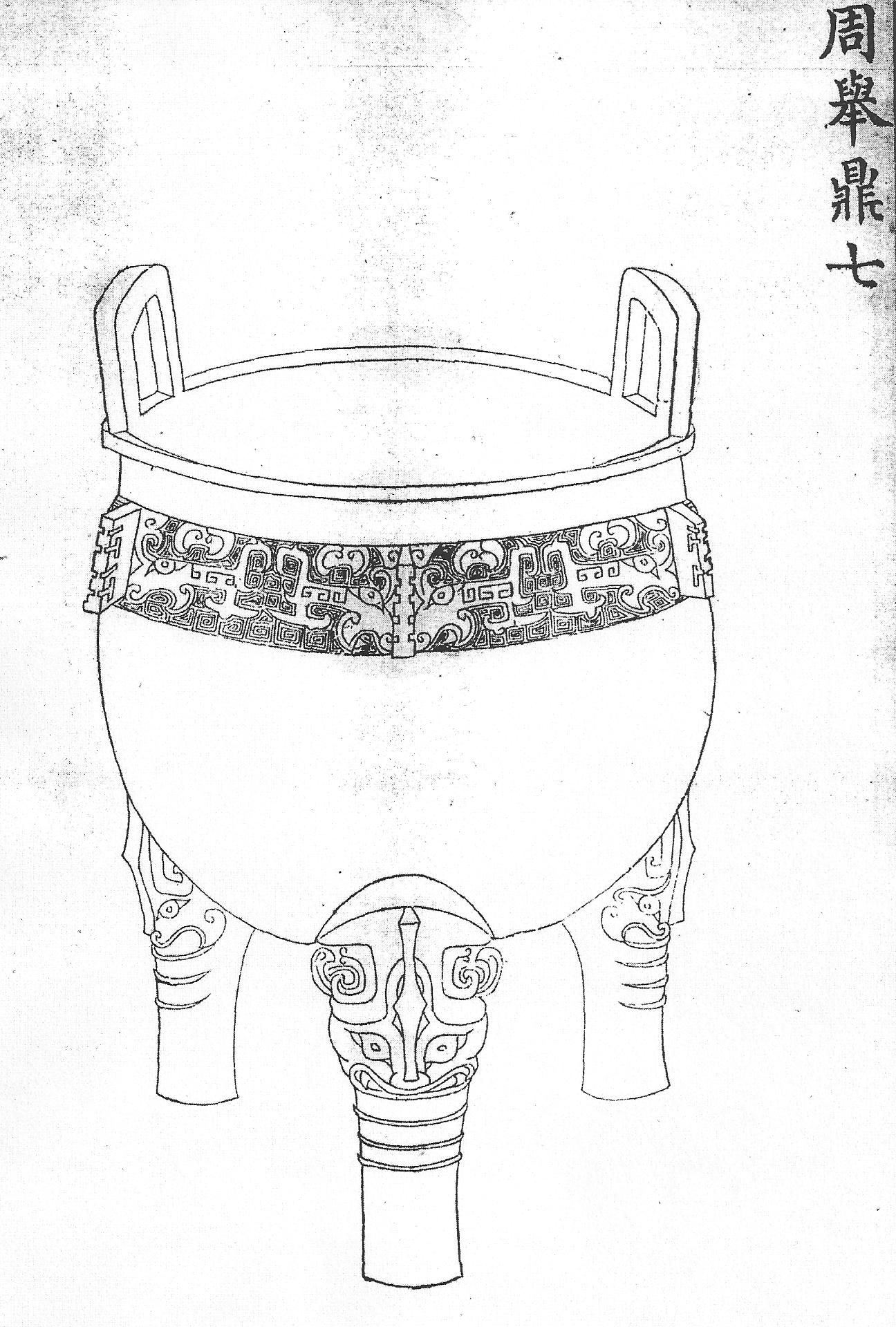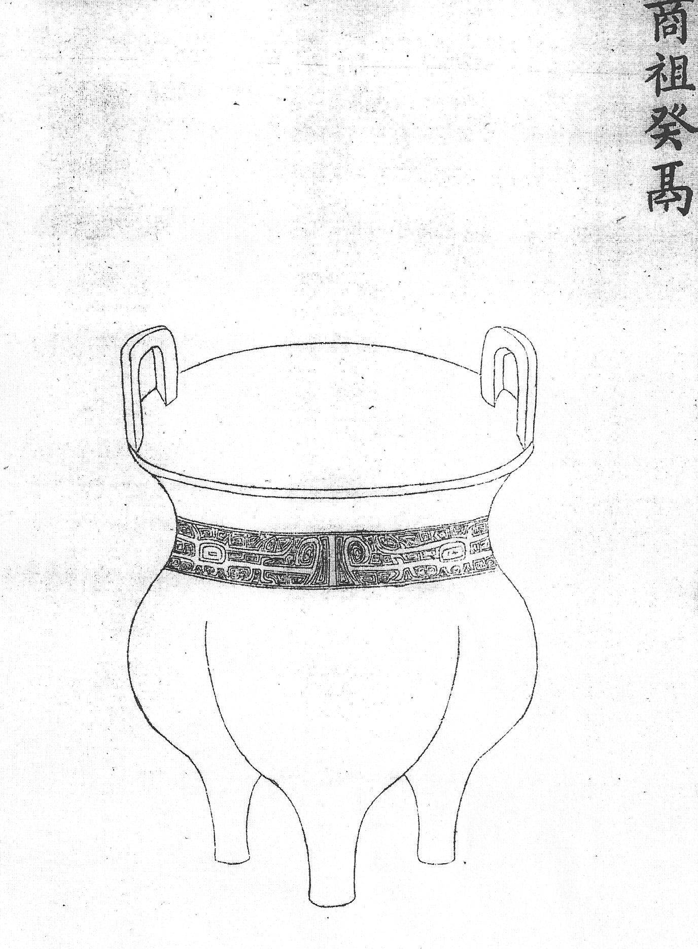 Ил.17. Ритуальный бронзовый сосуд янь. Эпоха Чжоу. Гравюра каталога Циньдин Сицин гуцзянь [167, т. 30, c. 18].В каталоге представлены детальные прорисовки, описания и обмеры каждой вещи. Характерной приметой времени в цинских каталожных изображениях бронзовых сосудов явилось использование перспективных сокращений и сложных ракурсов, как это было и в придворной живописи XVIII века. Непреходящую ценность этот солидный труд имеет благодаря сделанной его составителями расшифровке надписей и печатей на предметах, в процессе которой архаичные формы написания были переведены на язык современных иероглифов с пометкой тех мест в тексте, которые дешифровать не удалось. Расположение вещей в каталоге отражает структуру их классификации знатоками цинского времени, которая во многом совпадает с логикой современных авторов, условно разделяющих бронзовые ритуальные сосуды на четыре больших группы – ритуальную утварь для приготовления пищи: котлы на трех или четырех высоких ножках – дин, янь (Ил.17) ли (Ил. 18); емкости для ее хранения (иногда имеющие крышку и установленные на ножках разной высоты – гуй, дуй, фу, сю, доу); винные сосуды (контейнеры – цзунь, лэй, ху, и, гун, ю и кубки – гу, цзюэ, цзяо, цзя); сосуды для воды (в том числе тазы для ритуальных омовений – пань, си, цзянь, кувшины и или хэ) [245, с. 8-24]. Ил.18. Ритуальный бронзовый сосуд ли. Эпоха Шан. Гравюра каталога Циньдин Сицин гуцзянь [167, т. 31, c. 1]. Появление в составе древней бронзы предметов определенного типа, как и их исчезновение, по-видимому, отражало изменения в порядке ритуала. Формы жертвенных сосудов одного и того же назначения часто заметно трансформировались с течением времени, образуя в определенные периоды подгруппы вторичных вещей, наделенных собственными названиями, что затрудняет их классификацию. В некоторых спорных случаях исследователям помогают «самоназвания» предметов, встречающиеся в надписях на бронзе, но и они не дают исчерпывающего решения проблемы, которая, однако, для цинских изделий из металла в «древнем стиле» не столь актуальна.