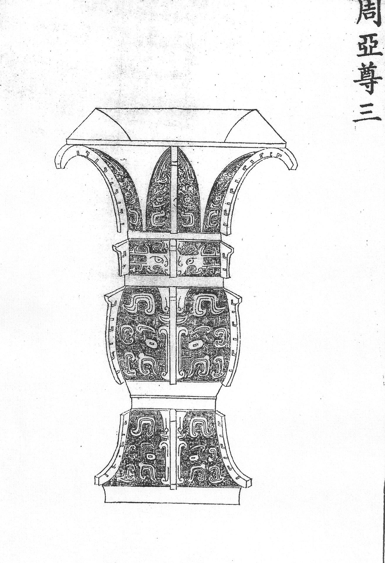 В древности сосуды цзунь могли существовать как сами по себе, так и в наборе с другими винными контейнерами – и (в том числе их «квадратной» разновидностью – фанъи, напоминавшей по форме модель здания с массивной двускатной крышей) или с сосудом ю, распространившимся в середине эпохи Западная Чжоу. Винные контейнеры ю имели вид круглой скульптуры животного или птицы, а также сосуда как такового, дополненного пластичными зооморфными деталями [например, 167, т. 15, с. 24]. Сосуды ю из металла с перегородчатой эмалью периода Цяньлун, стилизованные в духе чжоуской бронзы, сохранились в коллекции пекинского дворца [160, с. 155, № 47] и некоторых европейских собраниях, например, Народном музее в Варшаве.