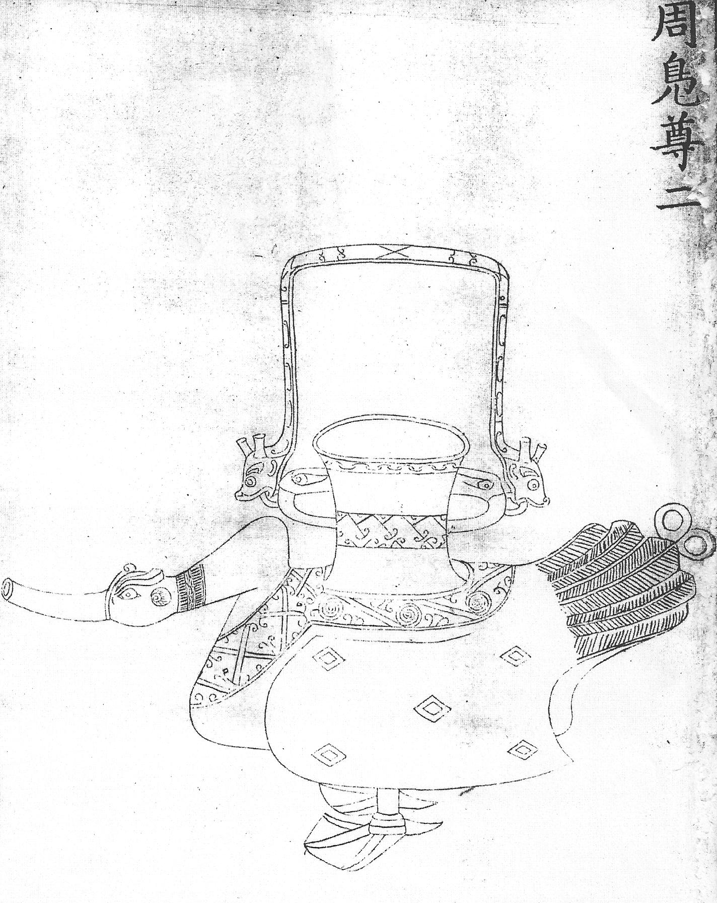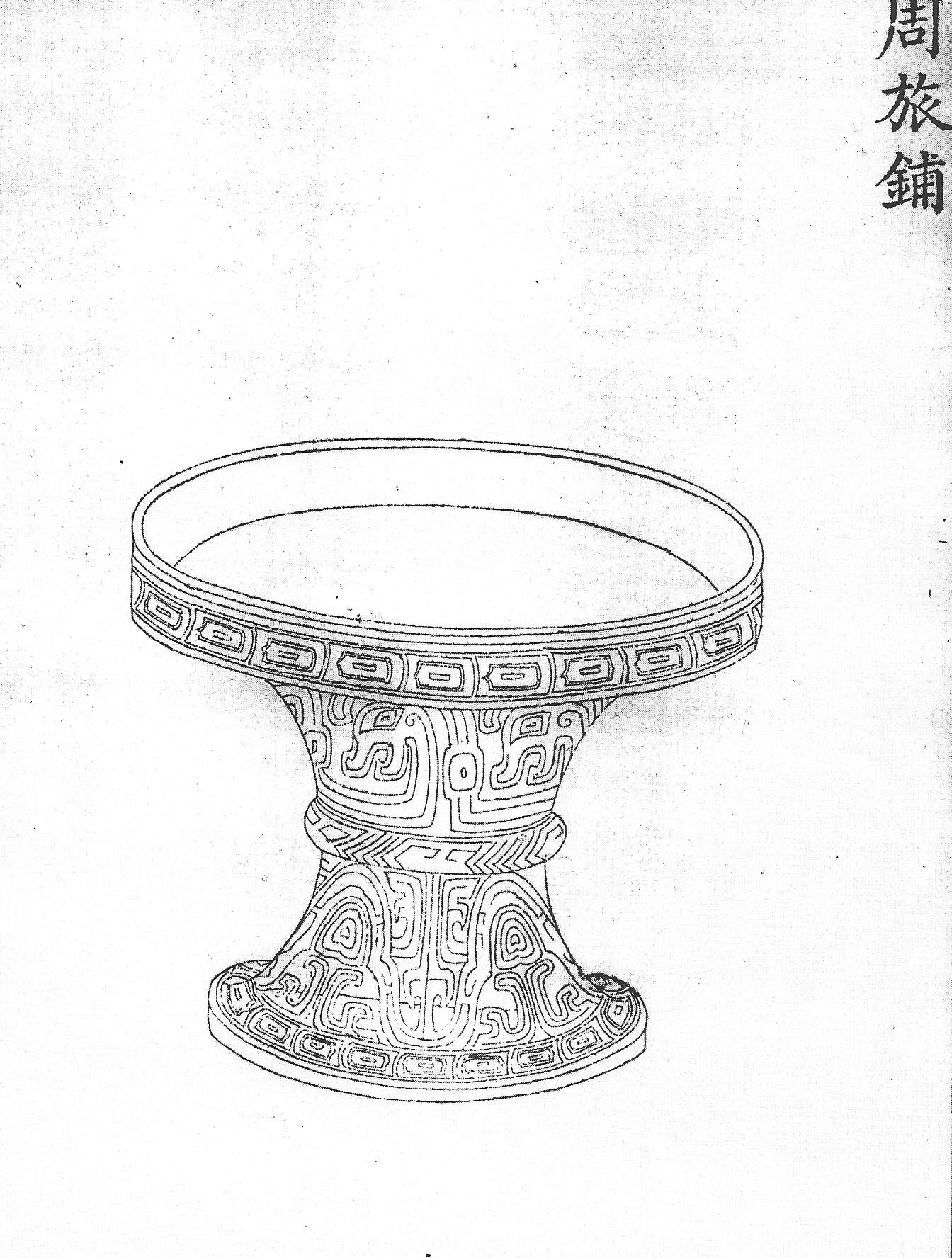 Ил. 4. Ритуальный бронзовый сосуд фу. Эпоха Чжоу. Гравюра каталога императорской коллекции древней бронзы Циньдин Сицин гуцзянь [167, т. 29, c. 3].В период Чжоу широко распространена круглая форма гуй, установленная на подставке, что делалось для удобства пользования чашей (поскольку в древности принято было во время еды рассаживаться и расставлять посуду прямо на полу). Форма чаши с подставкой воспроизведена в клуазонне периода Цяньлун из коллекции Олдри. Высокая подставка, отделанная перегородчатой эмалью, как и сама чаша, передавала идею подлинности археологической формы и имела в маньчжурское время только декоративное назначение [187, № 249].