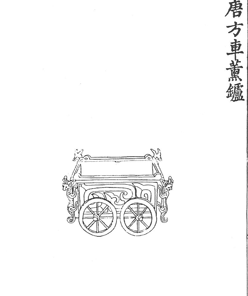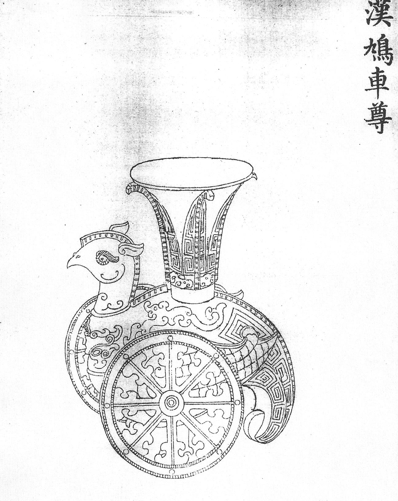 Ил.31. Бронзовый сосуд цзюцзюйцзунь. Эпоха Хань. Гравюра каталога Циньдин Сицин гуцзянь [167, т. 11, c. 29].С позднечжоуского периода известны сосуды цзунь в виде цзюцзюй (двухколесной повозки с установленной сверху фигурой птицы, Ил. 31), которые (наряду с другими моделями ритуальных вещей) служили в древности игрушками для августейших наследников, что известно из сопроводительных надписей на некоторых предметах. Стилизованные формы таких сосудов в период Цяньлун нередко отделывали перегородчатой эмалью.