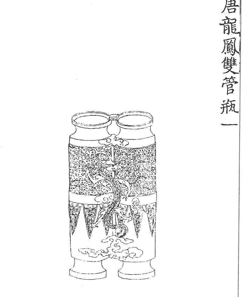 Ил.38. Двойная бронзовая ваза шуангуаньпин со скульптурными изображениями дракона и феникса. Эпоха Тан. Гравюра каталога Циньдин Сицин гуцзянь [167, т. 18, c. 14].Наряду со стилизациями чжоуских форм, в художественном металле и эмалях XVII – XVIII веков существует некоторое количество вещей, обращенных к оригиналам ханьского и более позднего времени, в том числе тем из них, которые тоже были выполнены в «чжоуском стиле». Танским периодом знатоки эпохи Цин датировали бронзовые сосуды из дворцовой коллекции, названные ими лунфэн шуангуаньпин (ваза с двойным цилиндрическим туловом и фигурами дракона и феникса, Ил.38). Опубликованный в императорском каталоге сосуд этого типа, послужил прообразом декоративных композиций XVIII века [187, ил.208](Ил.39).