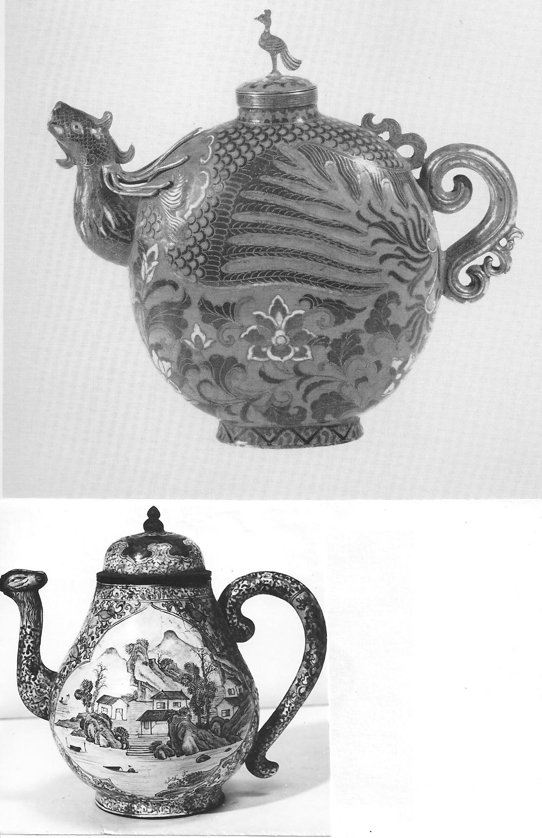 Ил.34. Вверху: Чайник. Металл, перегородчатая эмаль, чеканка, золочение. Китай, марка и период Цяньлун [187, № 260]. Внизу: Чайник. Металл, расписная эмаль, золочение. Китай, 1730-40-е гг. ГМВ, Москва (инв. № 3089 I) [96, № 35].О необычайной популярности упомянутой формы в китайском художественном металле XVII-XVIII веков свидетельствует то неожиданное развитие, которое тип чайника с зооморфным носиком получил даже в ориентированном на Китай европейском искусстве. Примененная близко к середине XVIII века Н. Спримонтом в композиции серебрянной бульотки (Ил.35), эта форма вновь возникла в декоре неоклассических часов, созданных Ж. Фризаром в конце столетия (Ил.36).