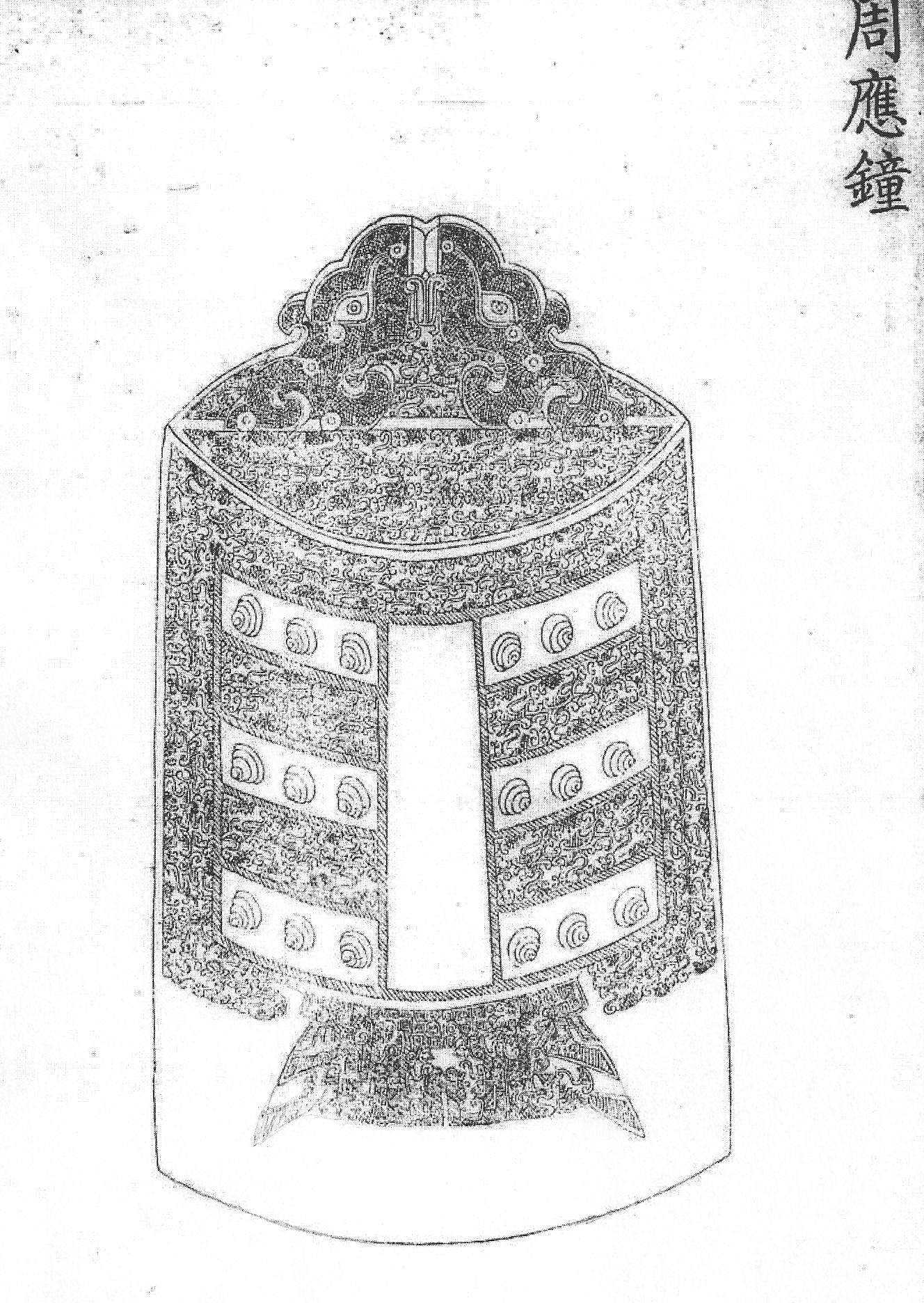 Ил.50. Ритуальный бронзовый колокол чжун. Эпоха Чжоу. Гравюра каталога Циньдин Сицин гуцзянь [167, т. 36, c. 3].К популярным типам предметов эпохи Чжоу следует отнести колокола чжун и бо сплющенной трапециевидной формы, пришедшие в ритуальной бронзе на смену шанским плоским гонгам. После чжоуского правления эти инструменты сохранились в ритуале других династий, поскольку считалось, что музыка выражает не чувства, а порядок, организованную и направленную силу, цель которой – объединение государства. В цинское время, по традиции, восходящей к древности (когда количество инструментов соответствовало рангу владельца), колокола образовывали наборы из многих предметов, различающихся размерами и звучанием. Стилизации чжоуских ритуальных колоколов, вошедших в каталог Циньдин Сицин гуцзянь, в годы Цяньлун нередко дополнялись декором в технике клуазонне (Ил.50,51).