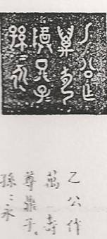 Ил.52. Гравированная марка Цзы сунь юн сай (Дети и внуки /пусть/ вечно сохранят) на древнем бронзовом сосуде и расшифровка ее в каталоге Циньдин Сицин гуцзянь [167, т. 8, c. 19-20]Набор стилизованных надписей такого рода, заключенных в формуле марки и эпиграфическом орнаменте, представлен в композиции чаши-пиалы вань из золоченого металла с декором в смешанной технике перегородчатой и выемчатой эмали, поступившей в собрание ГМВ из пекинского дворца в составе даров МК КНР (Ил.52). Аналогичные предметы, вероятно, находившиеся в пользовании Цяньлуна, сохранились в пекинской коллекции [165, с. 194, ил. 278].